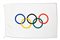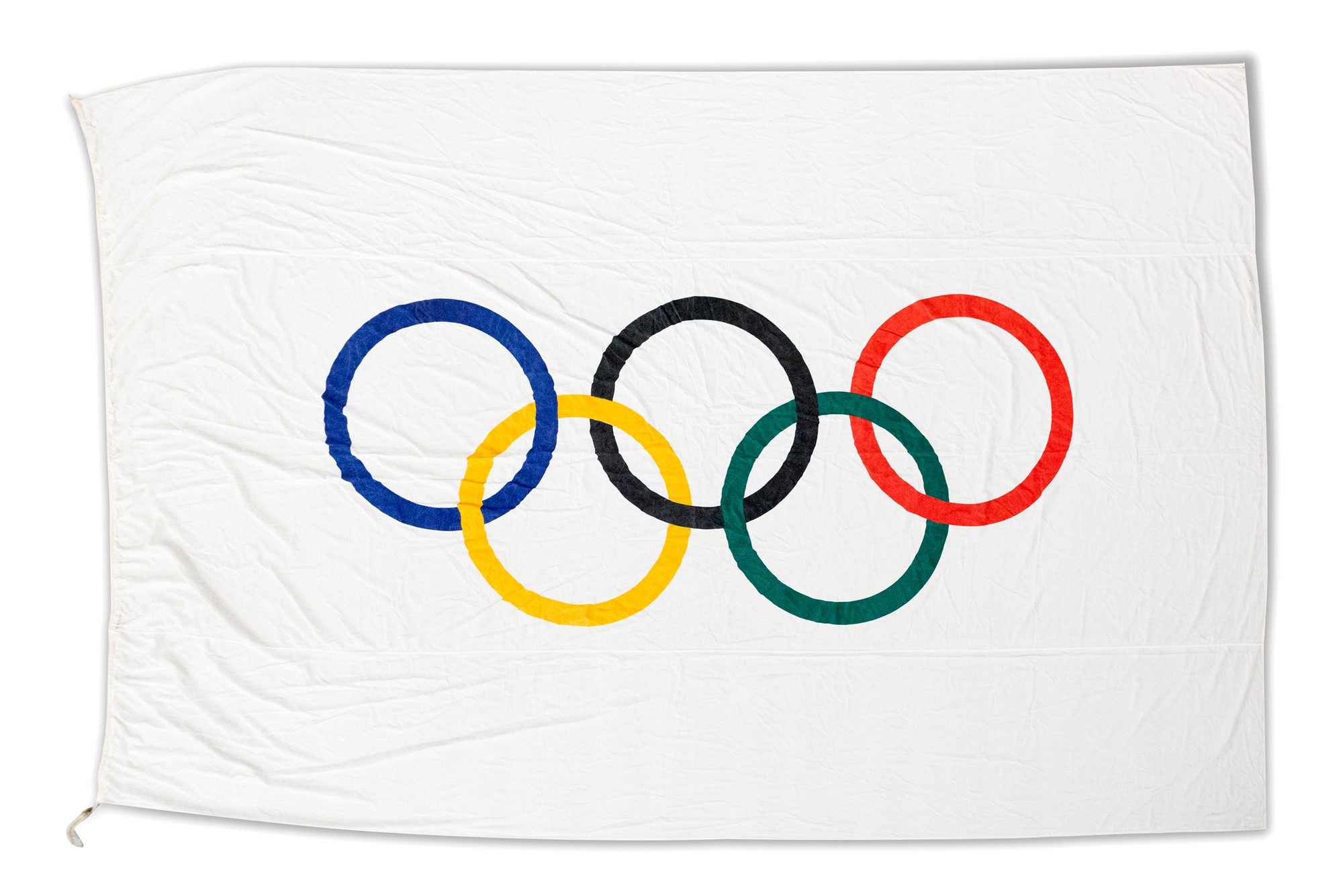 Bandiera in cotone e lino bianco, con al centro gli anelli olimpici a colori, cm. 270 x 400, lievi macchie.