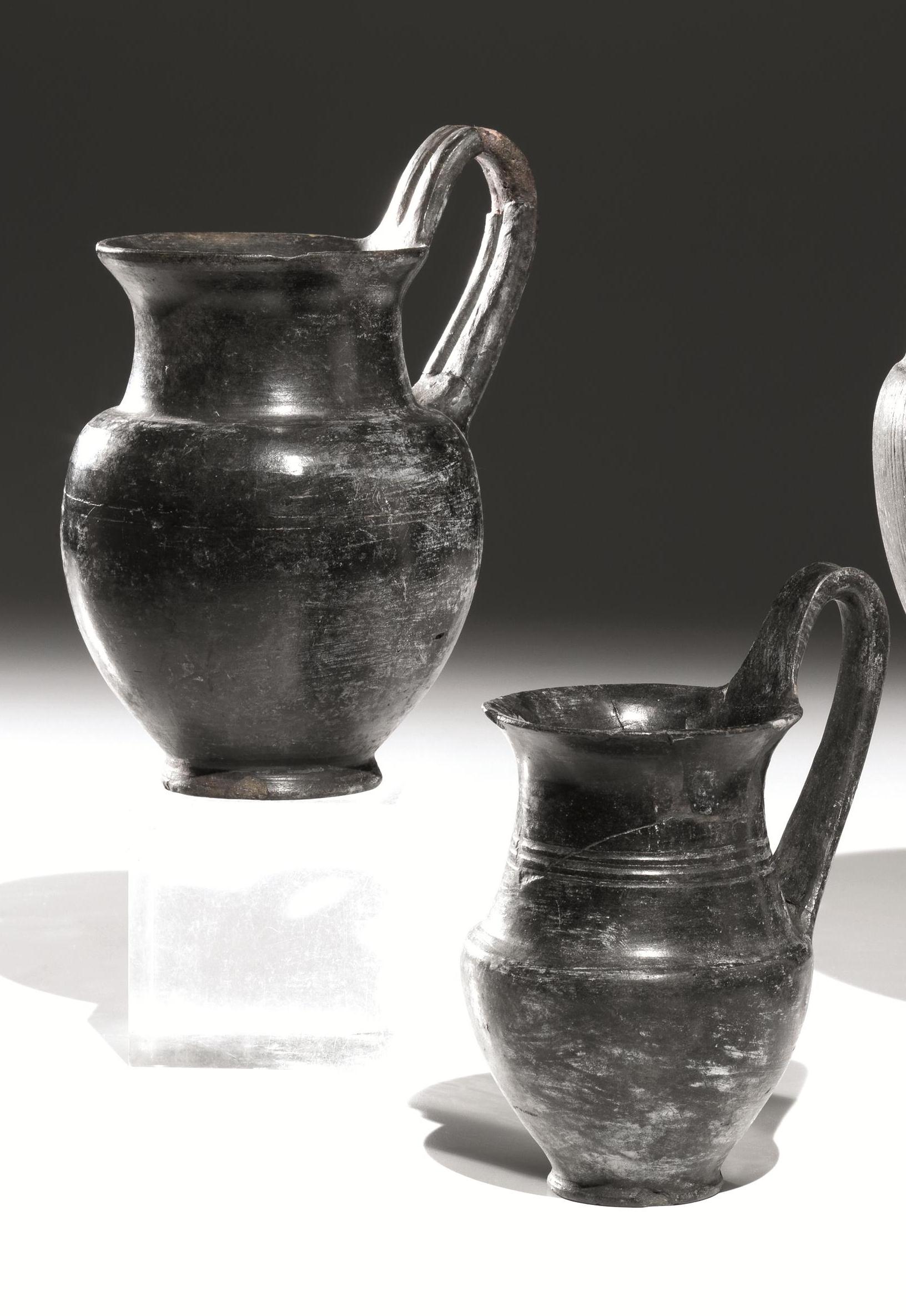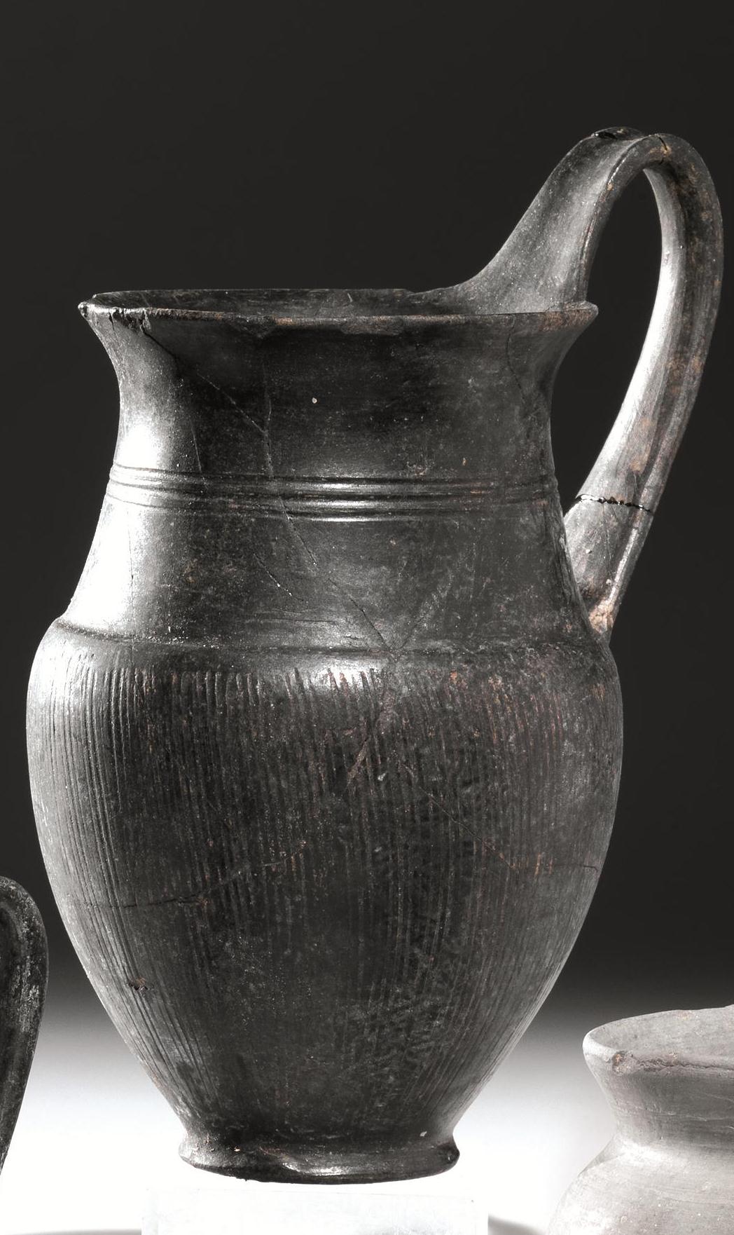 Materia e tecnica: bucchero nero lucidato a stecca, decorazione ad incisione, modellati a tornio veloce