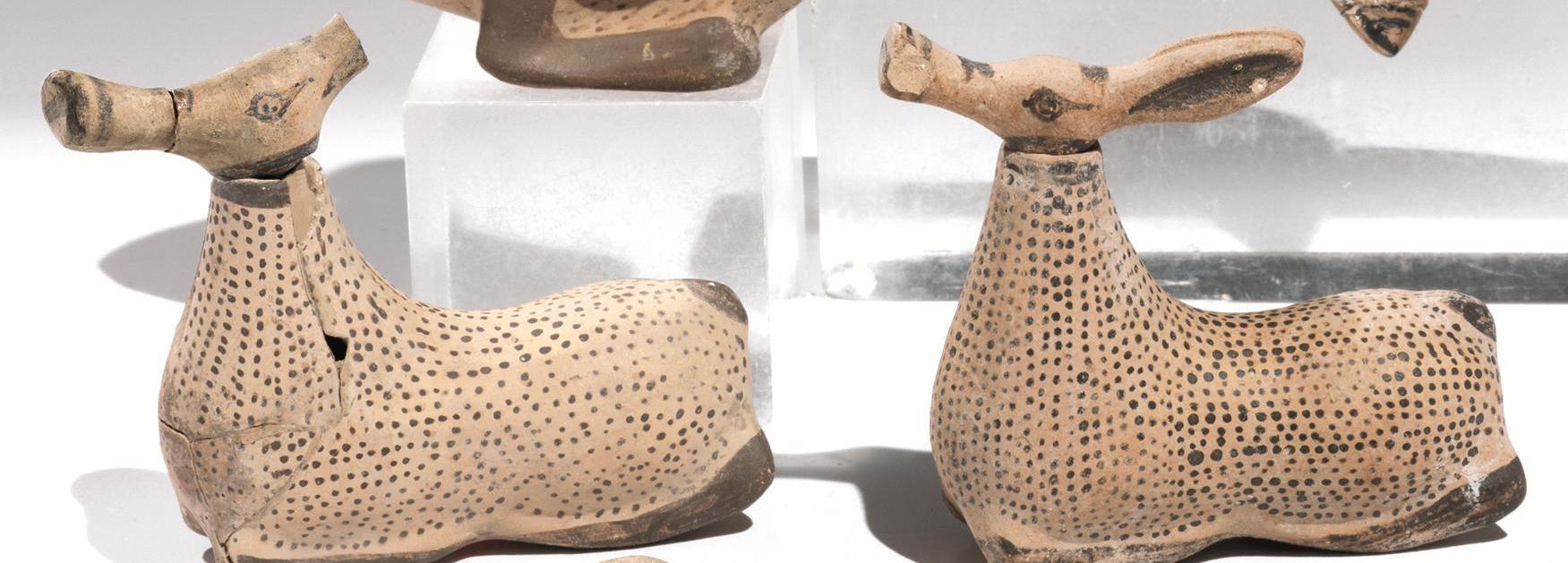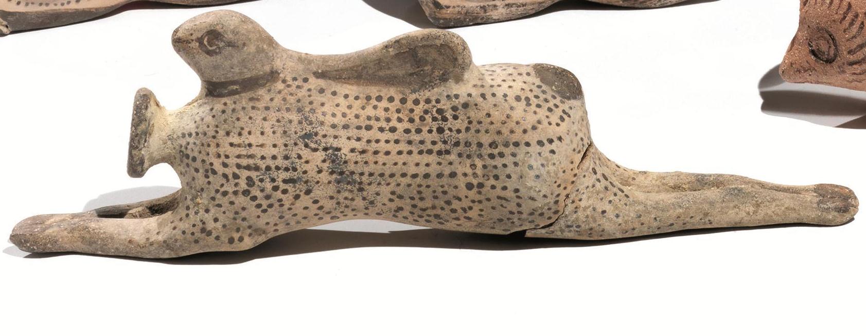 Due unguentari realisticamente modellati come un cerbiatto con le zampe ripiegate sotto al corpo, il collo e le orecchi erette; il corpo è interamente decorato a puntini; un unguentario in forma di lepre lanciata in piena corsa con le zampe anteriori e posteriori completamente distese, la testa alta, le lunghe orecchie riunite all’indietro, la piccola coda appena accennata. Sul petto, anteriormente piccolo bocchello. Dettagli anatomici resi con accuratezza anche se in modo semplificato, occhi, orecchie e coda resi con vernice bruna, sul corpo file parallele di puntini (3)