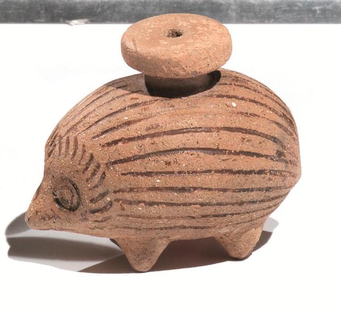 Piccolo unguentario realisticamente modellato a porcospino stante con