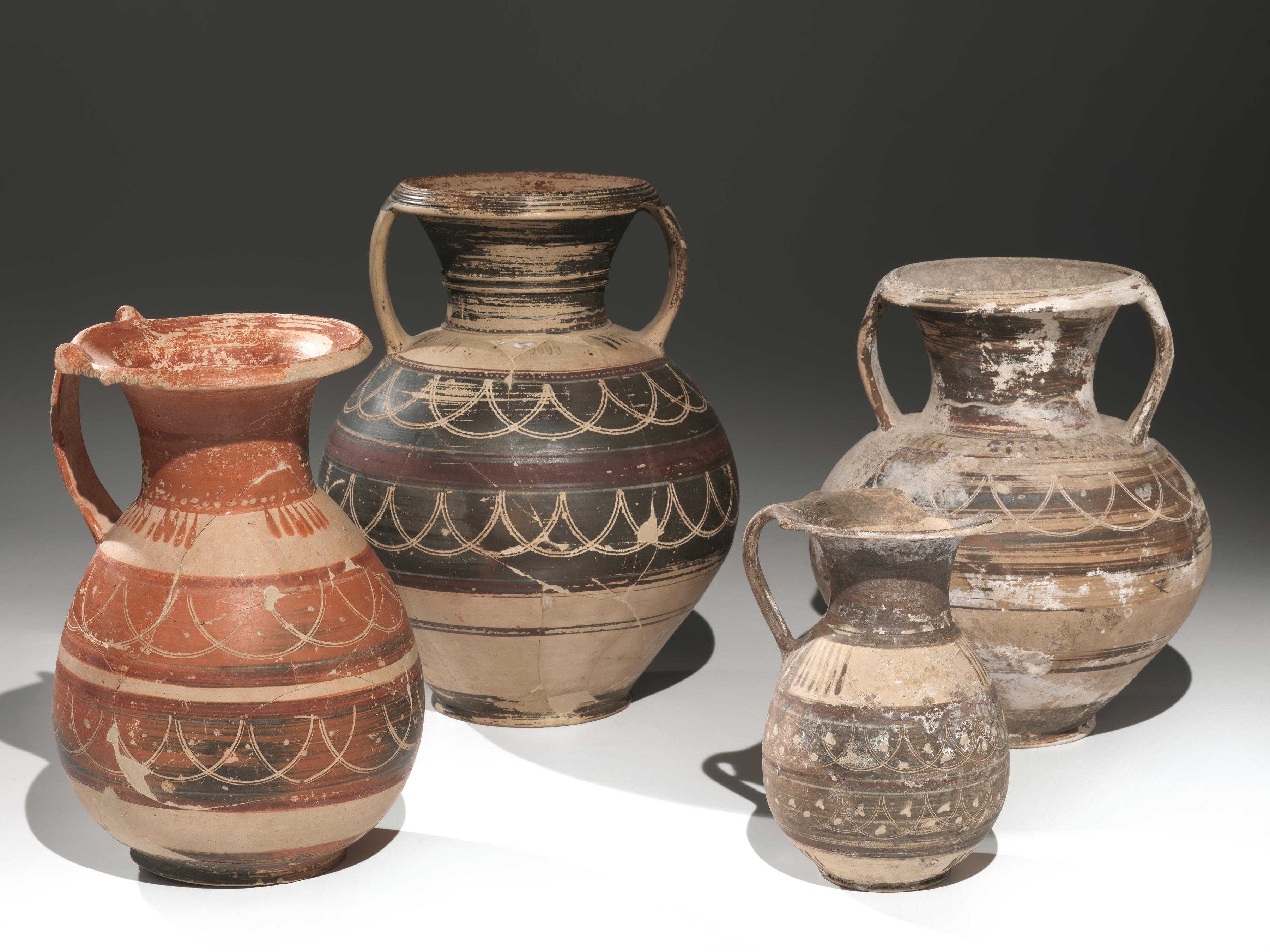 Due anfore con bocca rotonda, orlo obliquo esternamente e decorato con solcature in rilievo; ampio collo cilindrico svasato in alto, distinto mediante una solcatura, corpo ovoide, piede a disco; anse a nastro impostate verticalmente sul labbro e sulla spalla, due grandi olpai con bocca rotonda, alto collo cilindrico svasato in alto, distinto, corpo ovoide, piede a disco; ansa a nastro impostata verticalmente sul labbro e sulla spalla e decorata con due piccole rotelle laterali nel punto di attacco alla bocca del vaso (4)