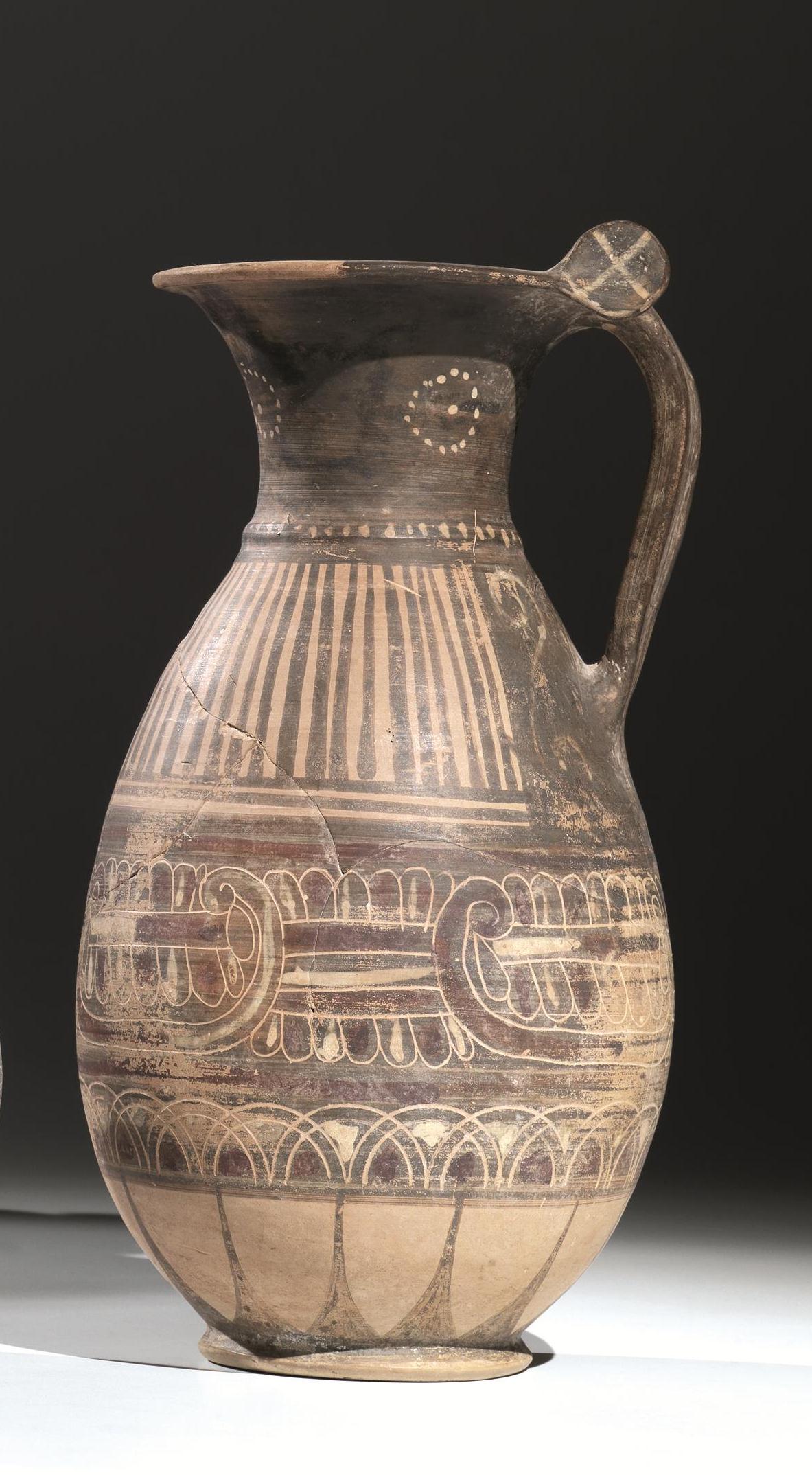 Olpe a rotelle corinzia Materia e tecnica: argilla figulina camoscio; vernice...