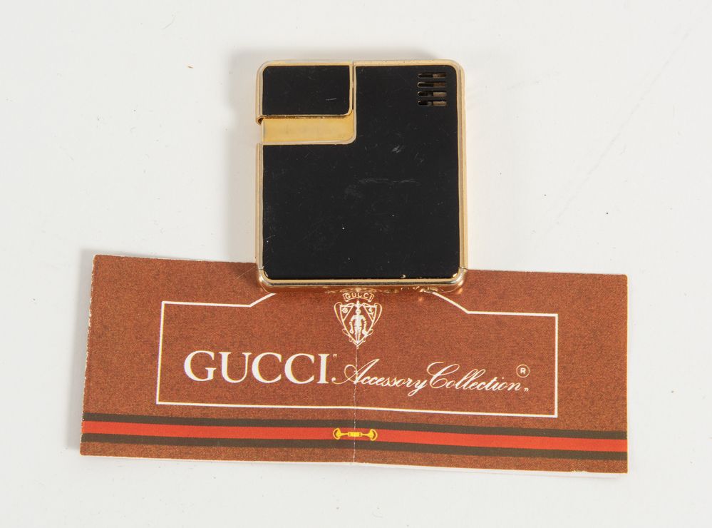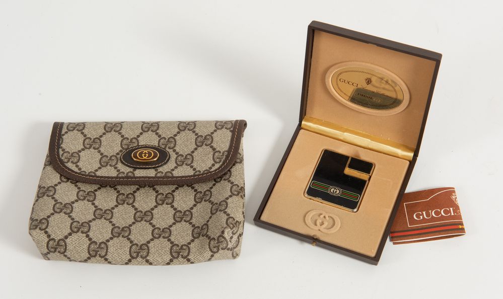 GUCCI Accessory Collection Lotto composto da pochette e accendino. Pochette cm 12x16, reca marchio Gucci Accessory Collection Made in Italy. Accendino cm 5x4,5x0,8, entro scatola originale recante marchio Gucci Accessory Collection Firenze.