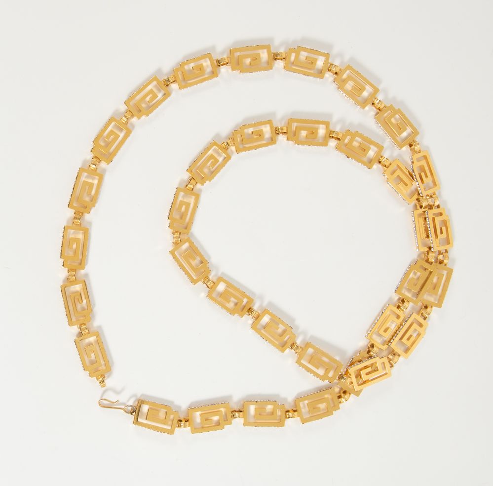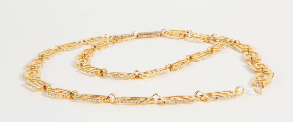 UGO CORREANI X VERSACE attr. Cintura in metallo dorato con strass, motivo neoclassico a greca. Primi anni 2000. Lughezza totale Cm 162. Lievi difetti.