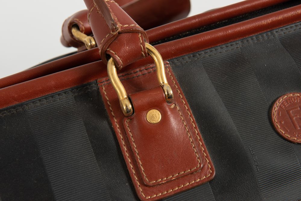 FENDI Pequin duffle bag. Borsone da viaggio, Anni '80. Cm 34x60x22. Corredato di manico/tracolla aggiuntiva originale di cm 104. Reca marchi Fendi s.a.s. Roma 1925. Made in Italy. (Lievi difetti)