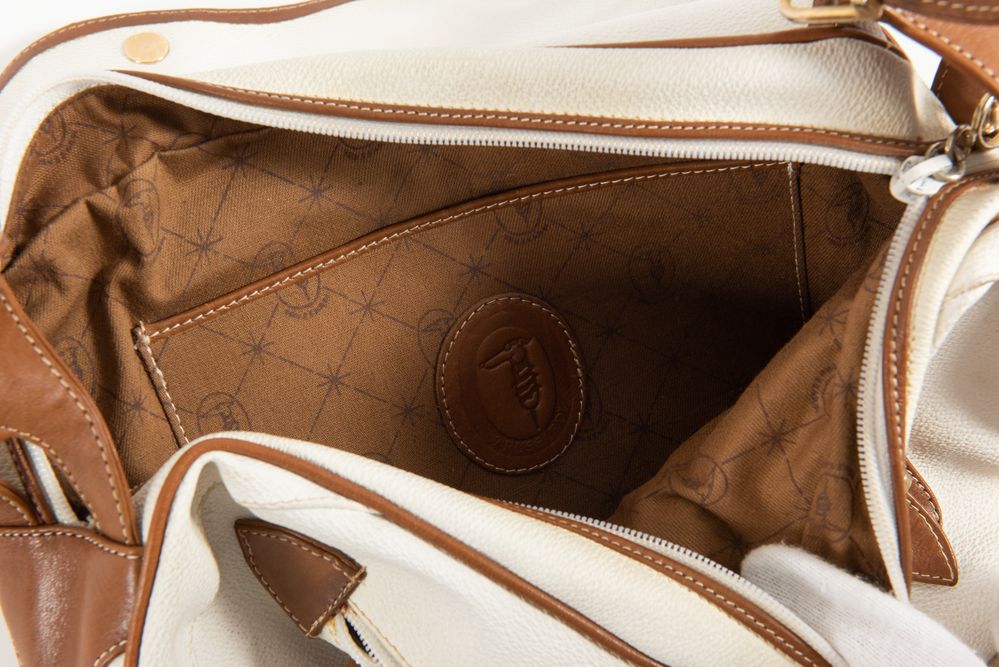 TRUSSARDI Borsa da spalla modello Postina in pelle liscia e martellata color panna e marrone rifinita con dettagli in metallo dorato. Composta da due vani portaoggetti chiusi da cerniera e taschina. Cm 23x34x7. Manico regolabile di cm 112. Reca marchi Trussardi.