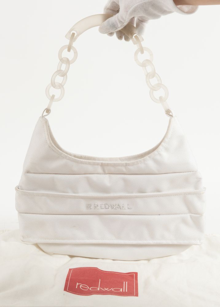 REDWALL Borsa da spalla in tela bianca con manico a catena in resina opaca. All'interno reca piccola pochette portaoggetti coordinata. Cm 27x34,5x3. Lunghezza manico: cm 38. Reca marchio Redwall. Corredata di dustbag originale.