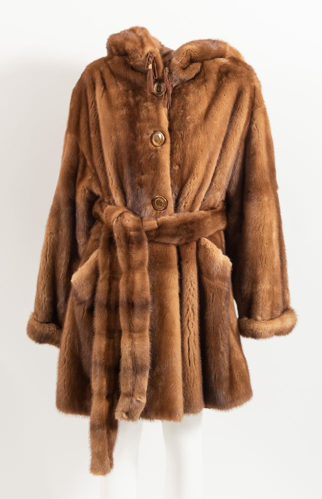 LANDI Cappotto in visone lunghezza 3/4 con cintura, cappuccio e tasche....