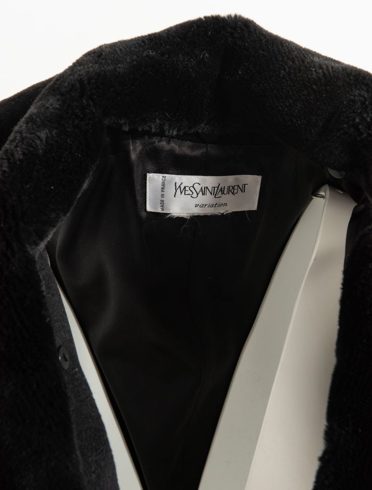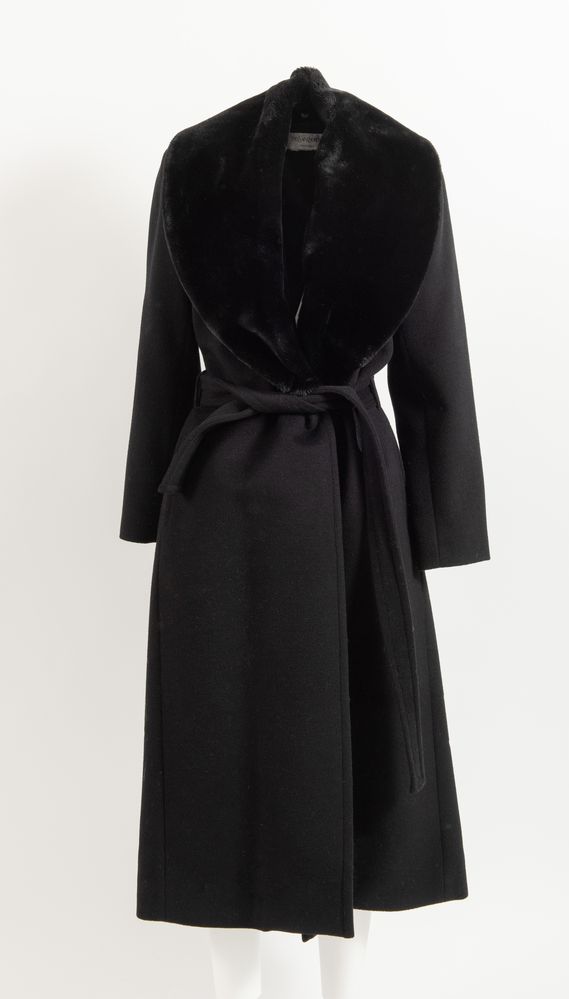 YVES SAINT LAURENT Variation Cappotto lungo in lana nero con cintura. Collo removibile in pelliccia ecologica. Interno e rifiniture in seta nera. Taglia non riportata: 44 ca. Reca etichetta Yves Saint Laurent Variation Made in france.