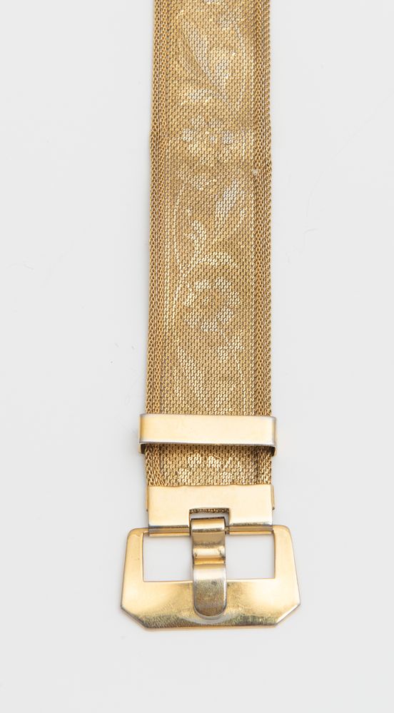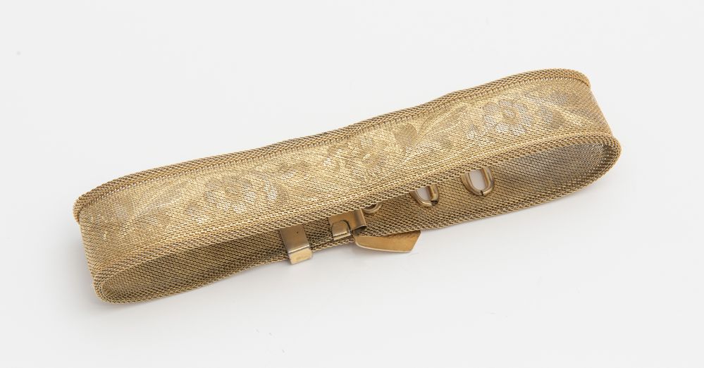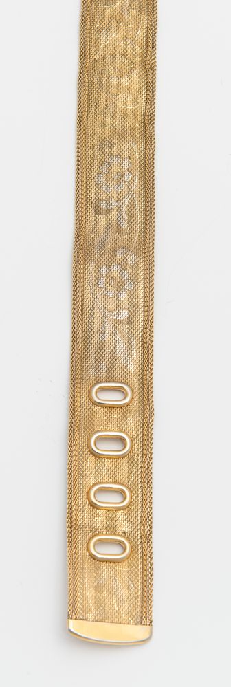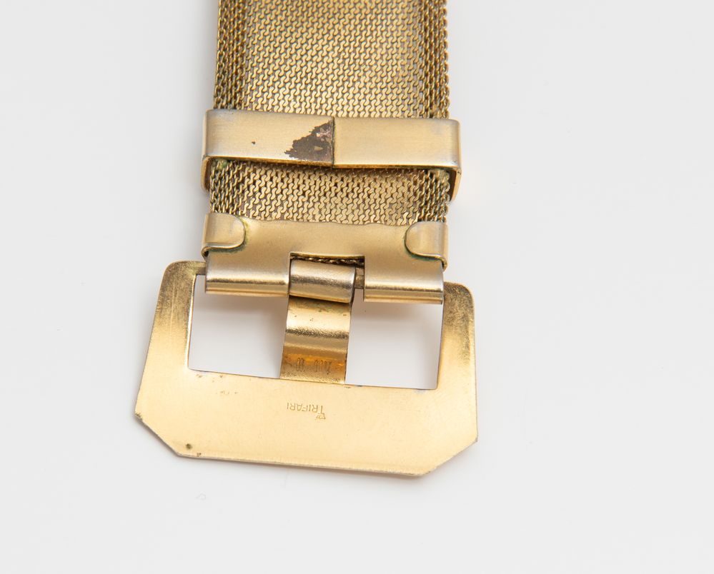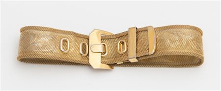 TRIFARI Collier girocollo in metallo dorato realizzato come una maglia morbida. Chiusura a fibbia. Lunghezza cm 38. Reca marchio a fuoco della maison. (Difetti)