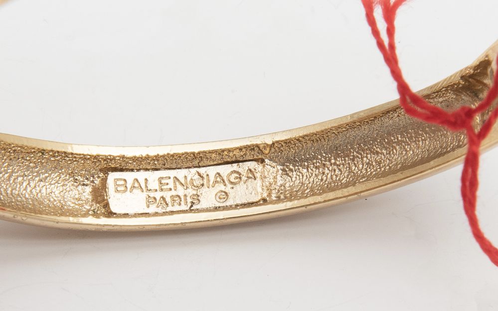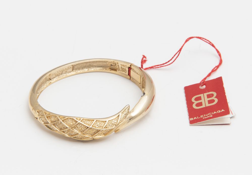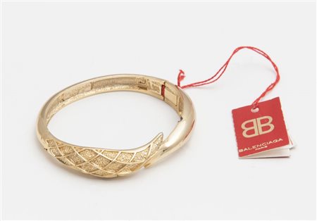 BALENCIAGA Bracciale rigido dorato. Anni '70 / '80. Reca marchio a fuoco della maison ed etichetta originale.