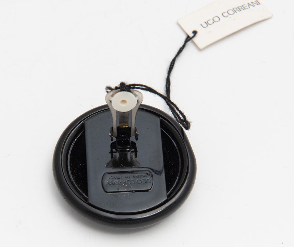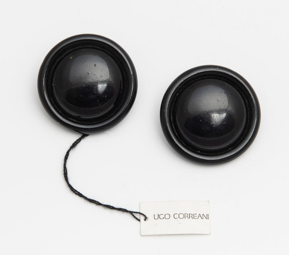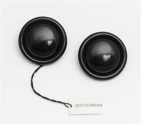 UGO CORREANI Orecchini a clips in metallo laccato nero. Anni '80. Cm Diamentro 4,3 cad. Recano marchio a fuoco della maison ed etichetta originale.