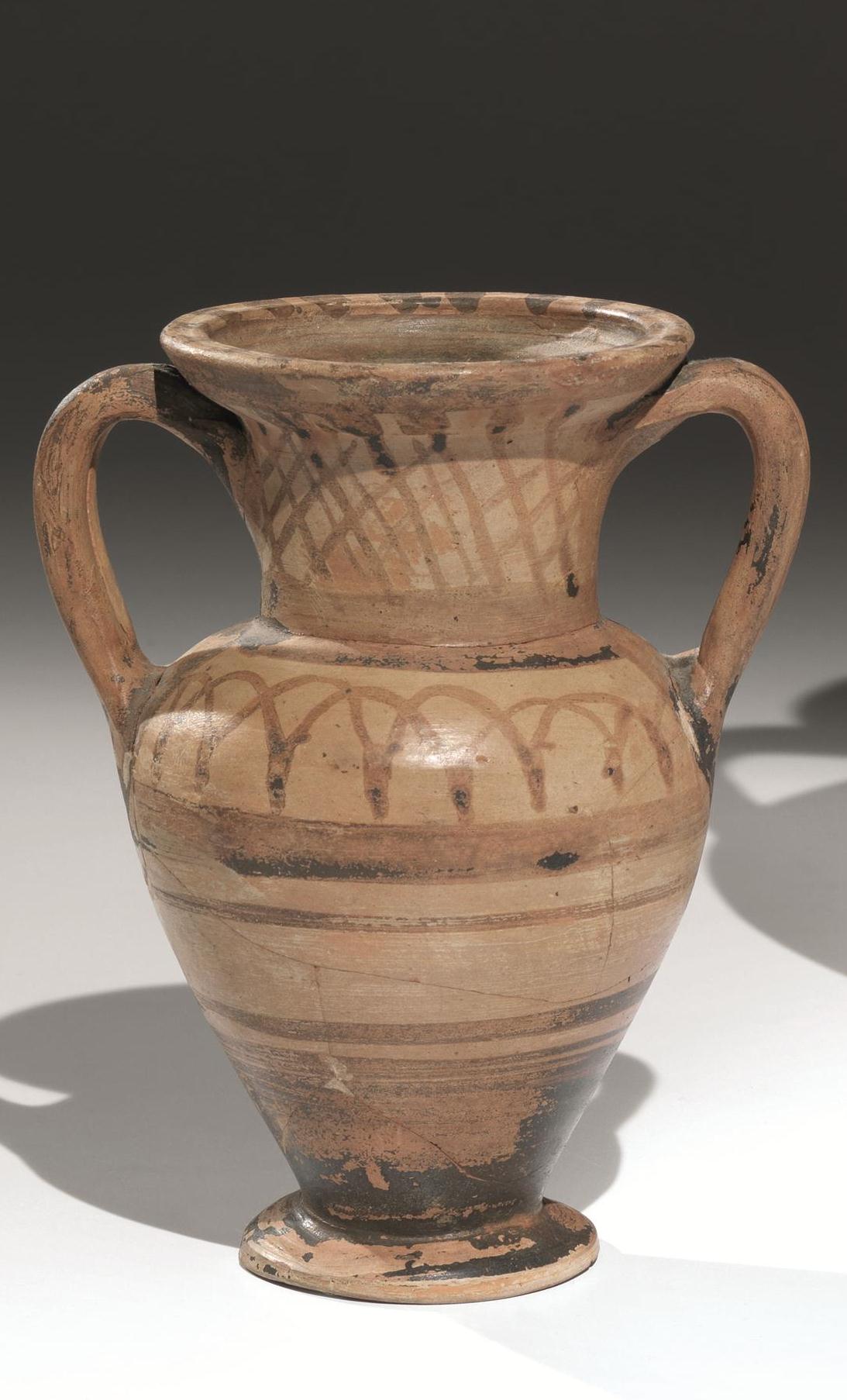 Decorazione: interamente eseguita a vernice bruna, sull’orlo tratti radiali, interno della bocca, anse ed esterno del piede verniciati, sul collo motivo a reticolo, sulla spalla catena di archetti intrecciati, sul ventre fasce parallele.
