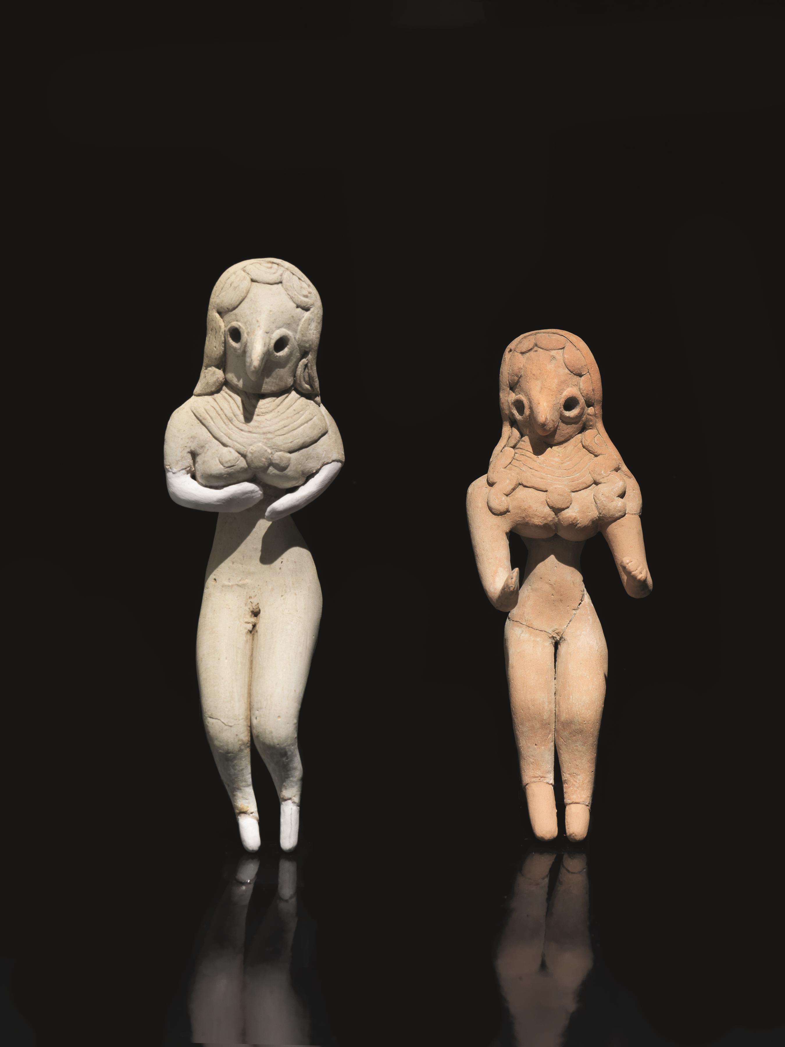 Due statuette sedute raffiguranti Dea Madre nuda con collane, teste