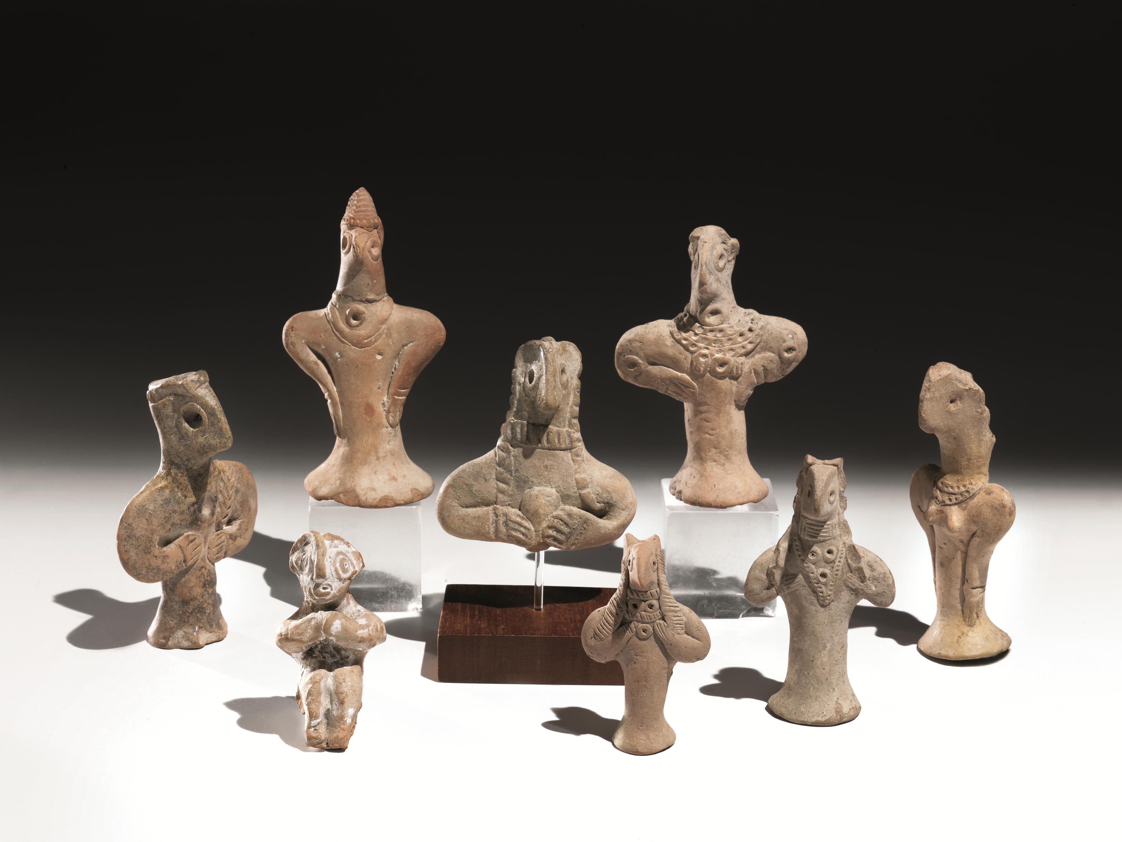 Gruppo di otto idoli a pilastroMateria e tecnica: argilla depurata camoscio e...