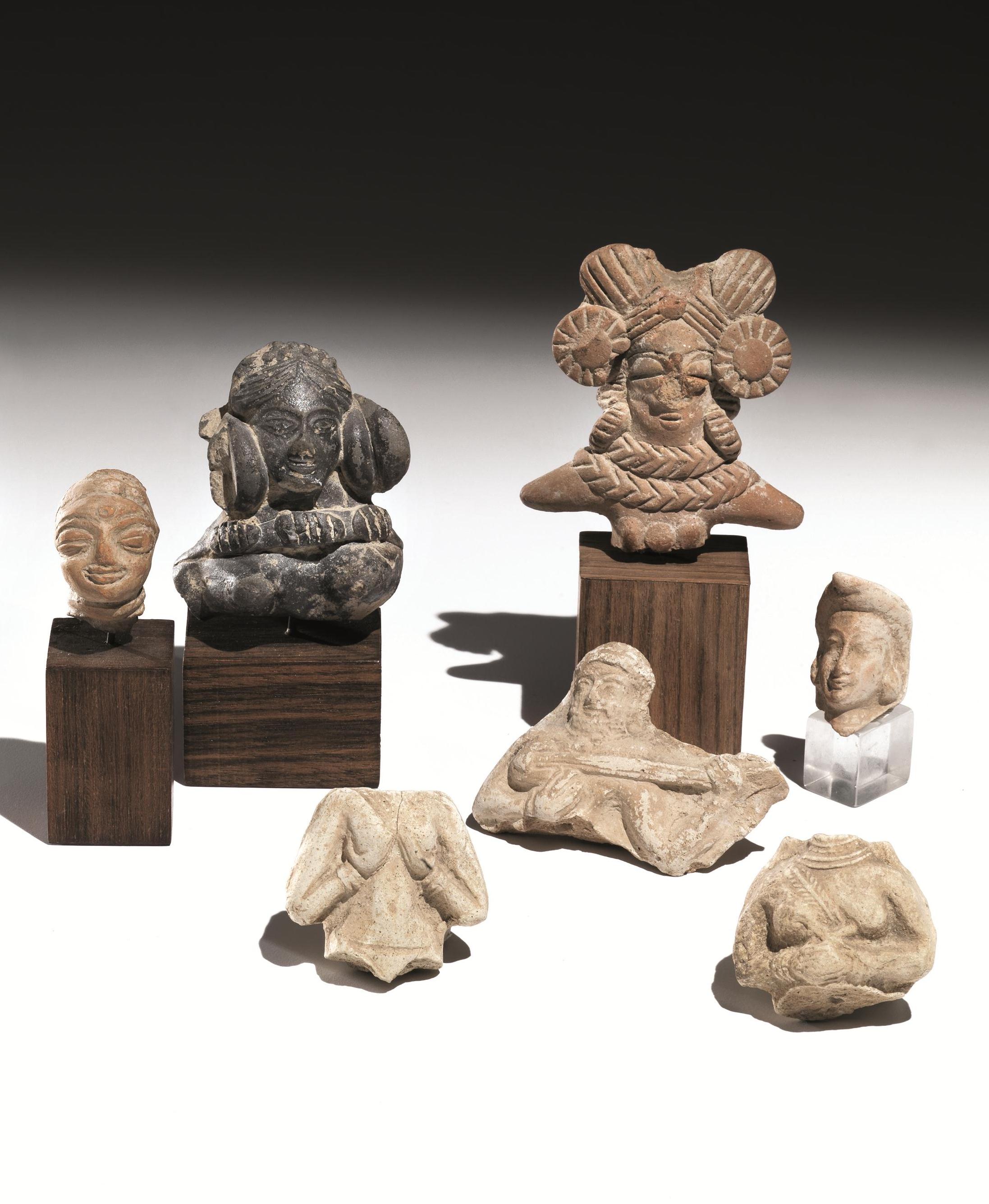Quattro statuette elamite frammentarie raffiguranti due busti di divinità femminili, probabilmente la dea Ishtar, un suonatore di uno strumento a corde ed una testa di divinità; due teste di divinità femminili indiane con elaborate acconciature dei capelli e grandi orecchini e due teste maschili stilizzate (8)