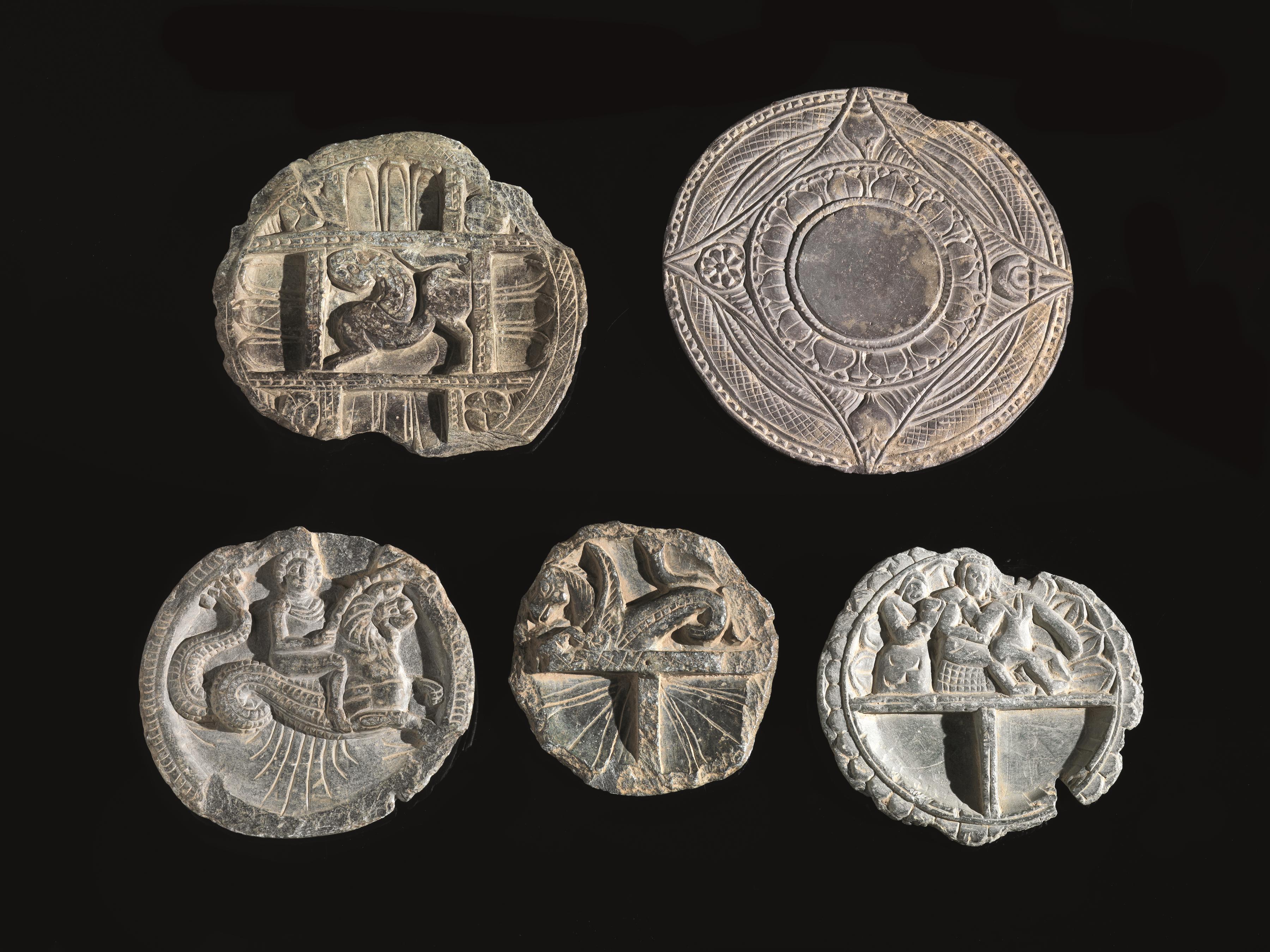 Cinque patere circolari in scisto decorate a incisione con motivi