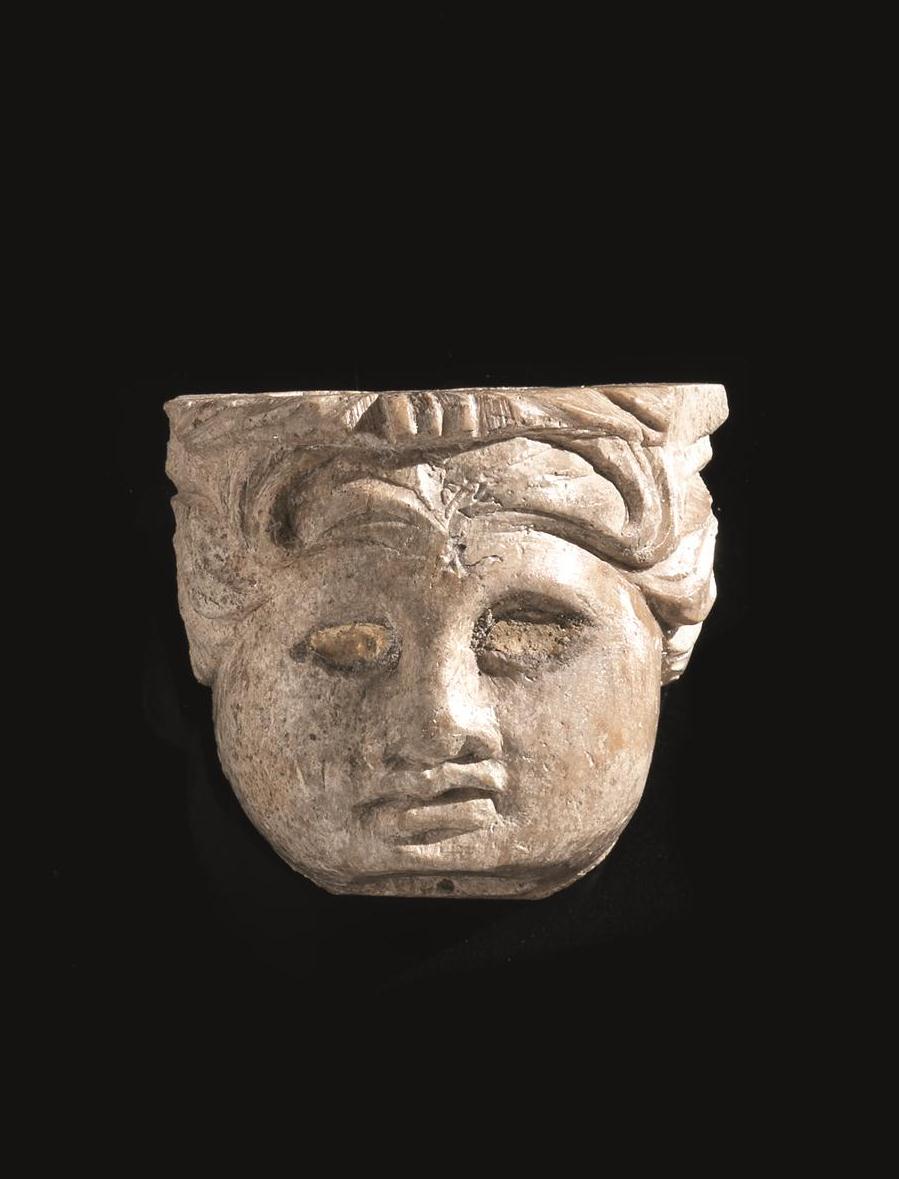 Frammento di testa femminile con capelli delineati a piccole ciocche ed occhi ricoperti da una lamina d’oro pertinente con probabilità alla gamba di un mobile