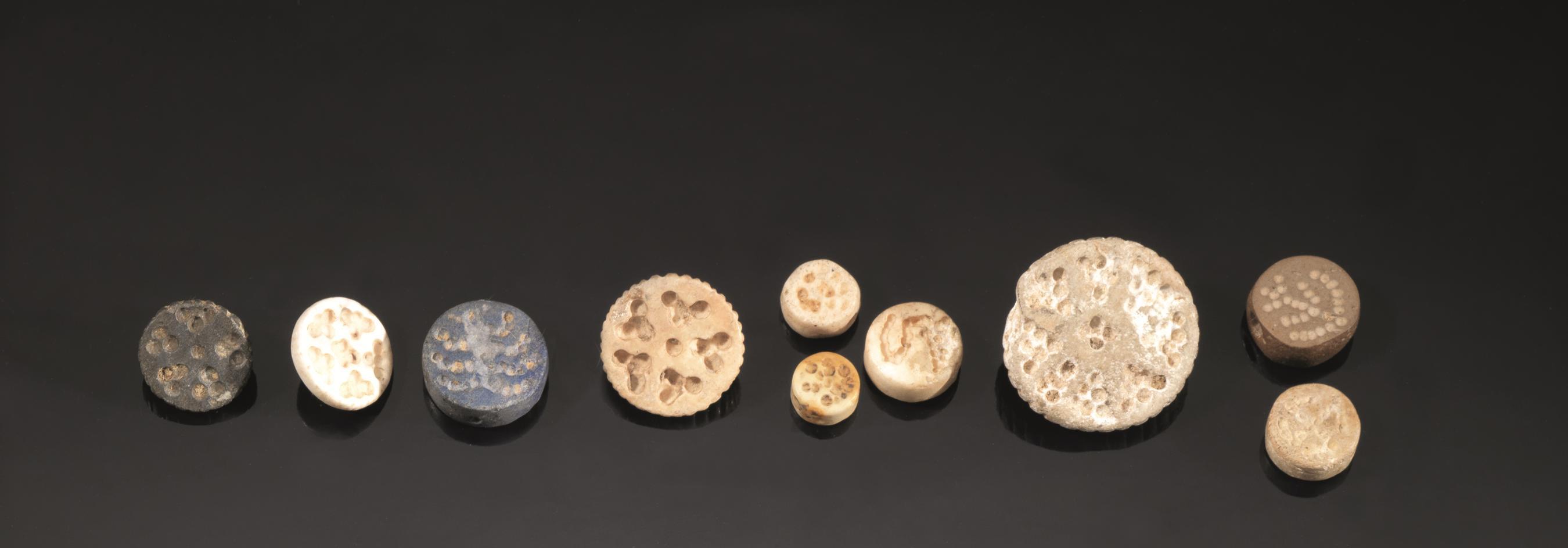 Dieci sigilli raffiguranti forme geometriche realizzate a puntini, uomini e animali fra cui si possono riconoscere un ragno, uno scorpione, serpenti, ancore e un dragone; quattro sigilli presentano piccola impugnatura a presa con foro passante e gli altri tutti con foro pervio sullo spessore (10)