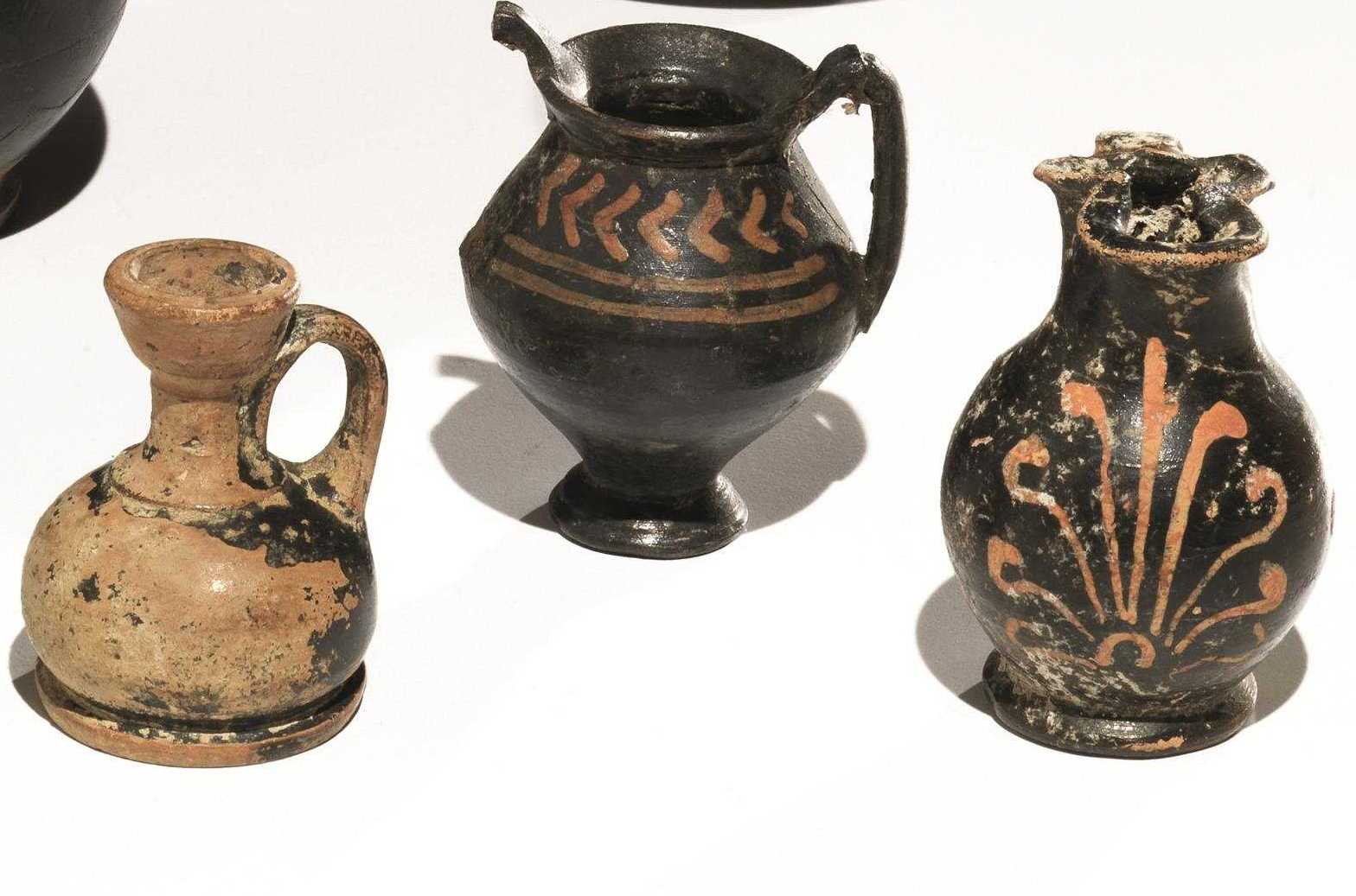 Un krateriskos con labbro estroflesso, corpo bitroncoconico, anse a nastro impostate verticalmente sull’orlo e sulla massima espansione, piede troncoconico modanato; una piccola oinochoe con bocca trilobata; una lekythos lenticolare (3)