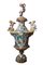 In maiolica policroma a fondo bianco, decorato a grottesche su fondo blu ed ocra; sormontato da statuetta di putto nudo alato in atto di danzare con la gamba destra sollevata e le braccia alzate sopra la testa che tengono i cembali; sopra le anse sono seduti altri due putti alati, nudi e con le gambe incrociate, uno in atto di suonare una tromba e l'altro una mandola; sotto le anse si trovano due mascheroni in altorilievo, nella parte centrale del vaso su entrambi i lati vi è una riserva sagomata con la rappresentazione di Venere e Cupido; le divinità sono raffigurate in un interno da una parte ed invece presso le sponde di un ruscello dall'altra. Attorno alle riserve dipinte vi sono arpie e grottesche su fondo blu. Piede sagomato su base ottagonale decorata anch'essa a grottesche.