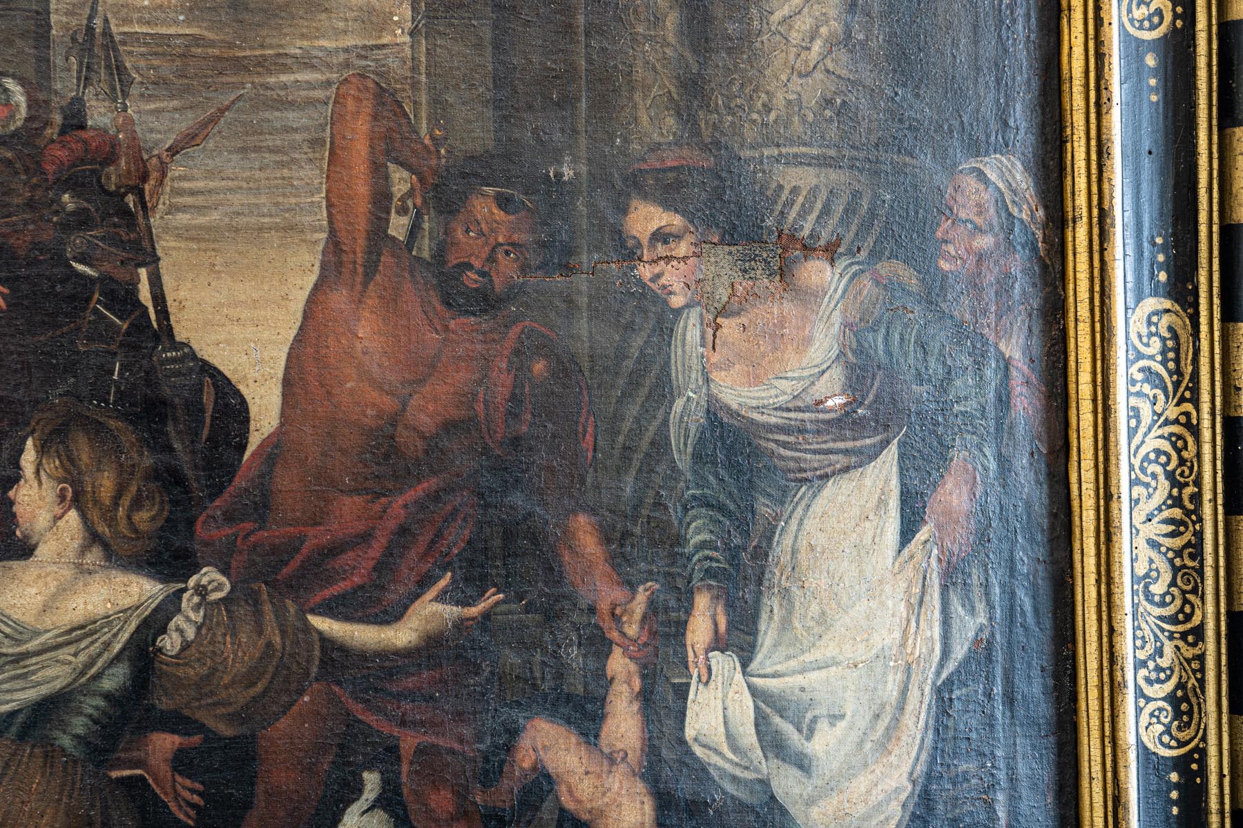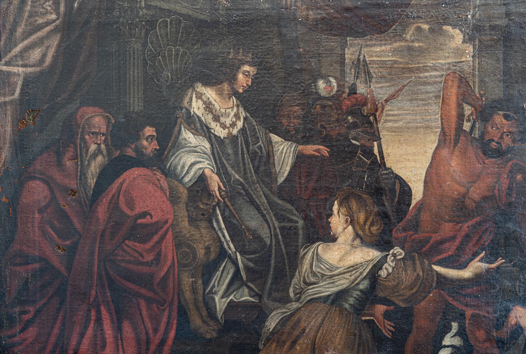 Il dipinto qui posto all'incanto raffigura l'episodio del Giudizio del Re Salomone, tratto dal Libro dei Re nell'Antico Testamento (I Re, 3, 16-28).