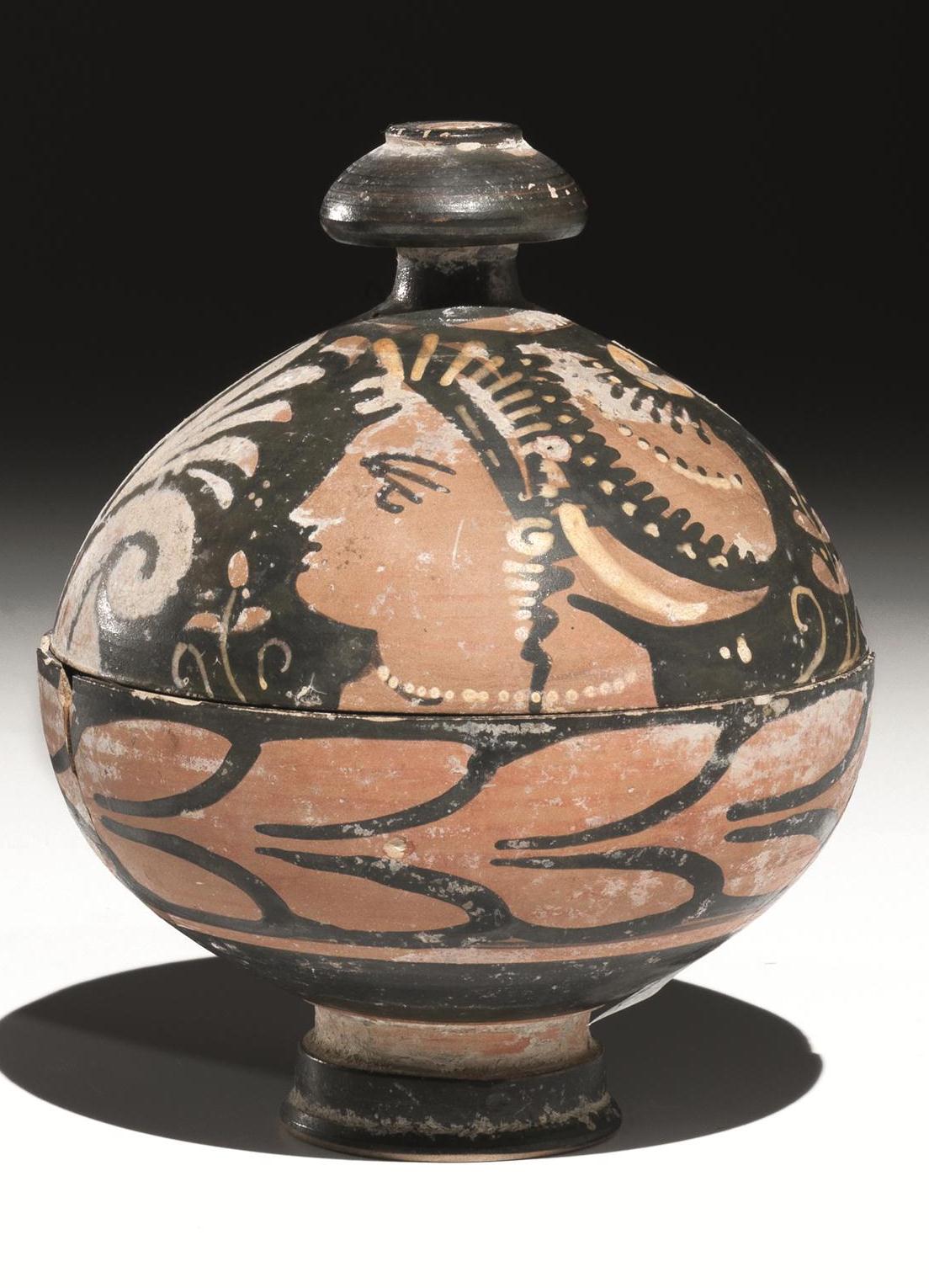 Decorazione: coperchio: lato A) testa femminile volta a destra con stephane radiata capelli avvolti in un sakkos ricamato, orecchini e filo di perle al collo, ai lati della testa riempitivi vegetali; lato B) palmetta aperta a ventaglio; fra i due lati semipalmetta aperta; coppa: ramo di alloro orizzontale; attacco col piede e interno del piede risparmiati