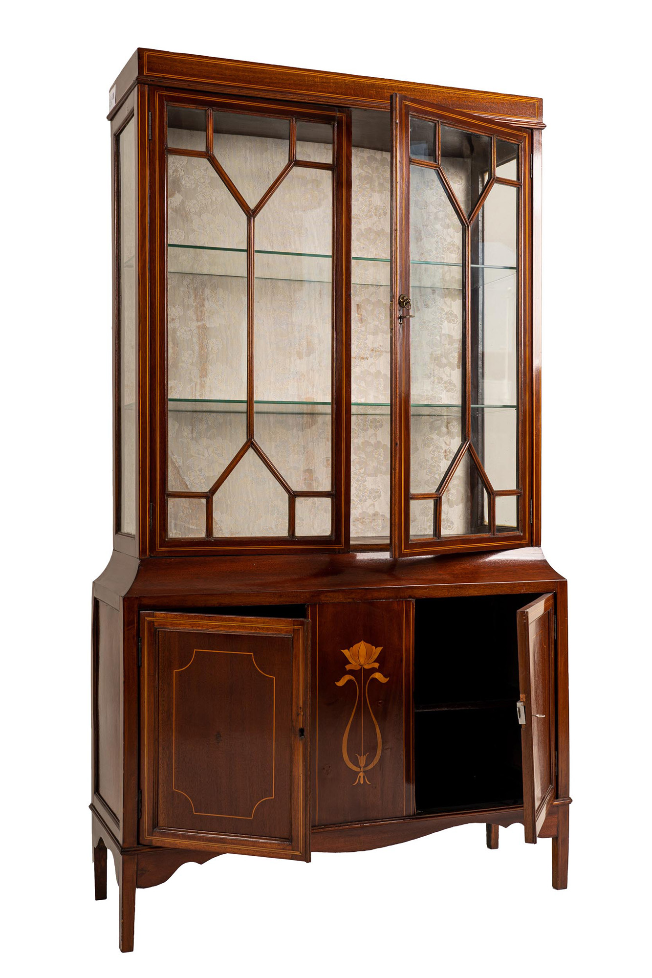 in mogano intarsiato a motivi floreali, due sportelli a vetri superiori e due sportelli nel corpo inferiore