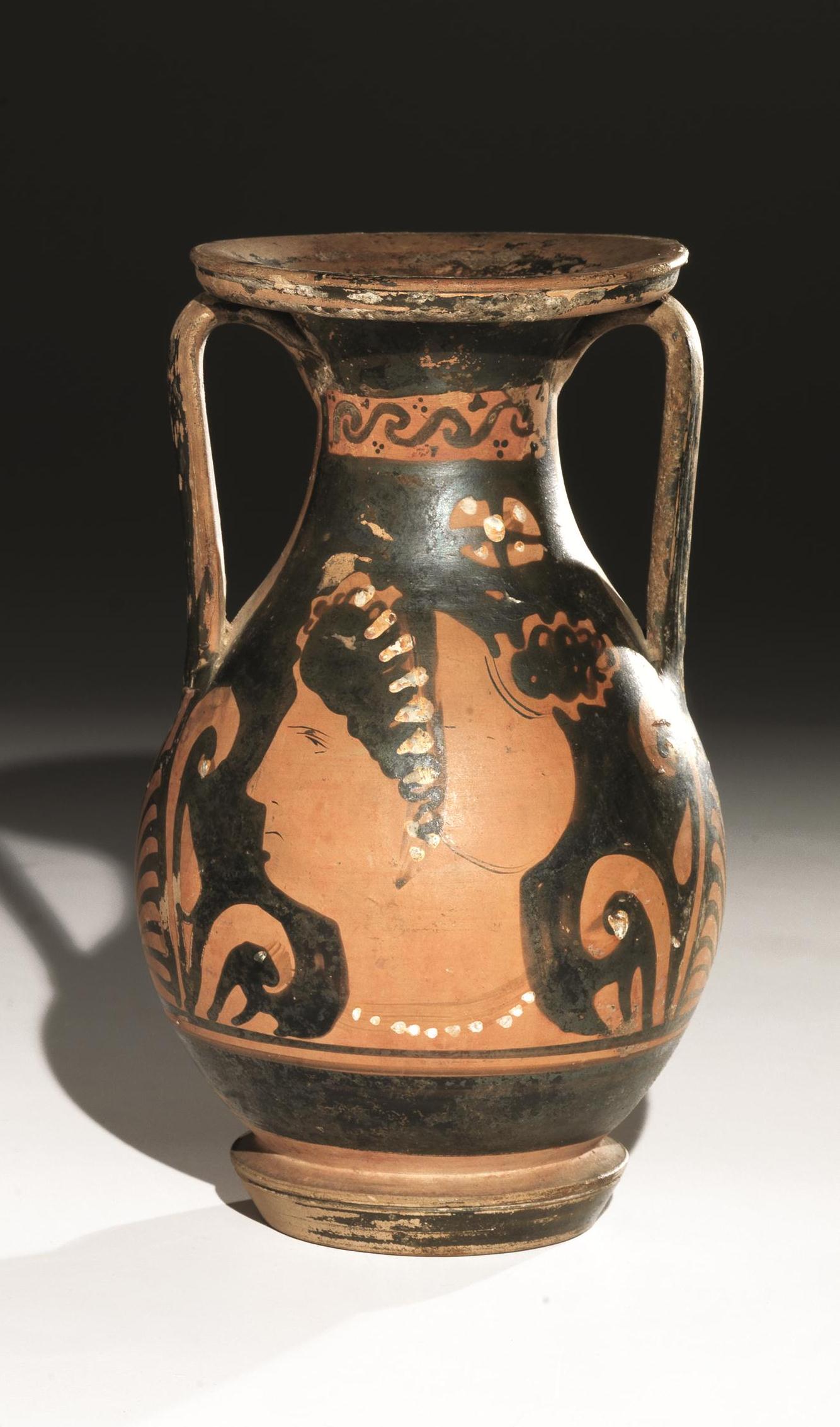 Decorazione accessoria: labbro e linea in fondo al corpo risparmiate; sul collo: lato A) con archetti e punti in nero; lato B) onde ricorrenti tra serie di fogliette e rosette in nero; sotto le anse palmetta aperta fra girali di riempimento