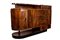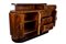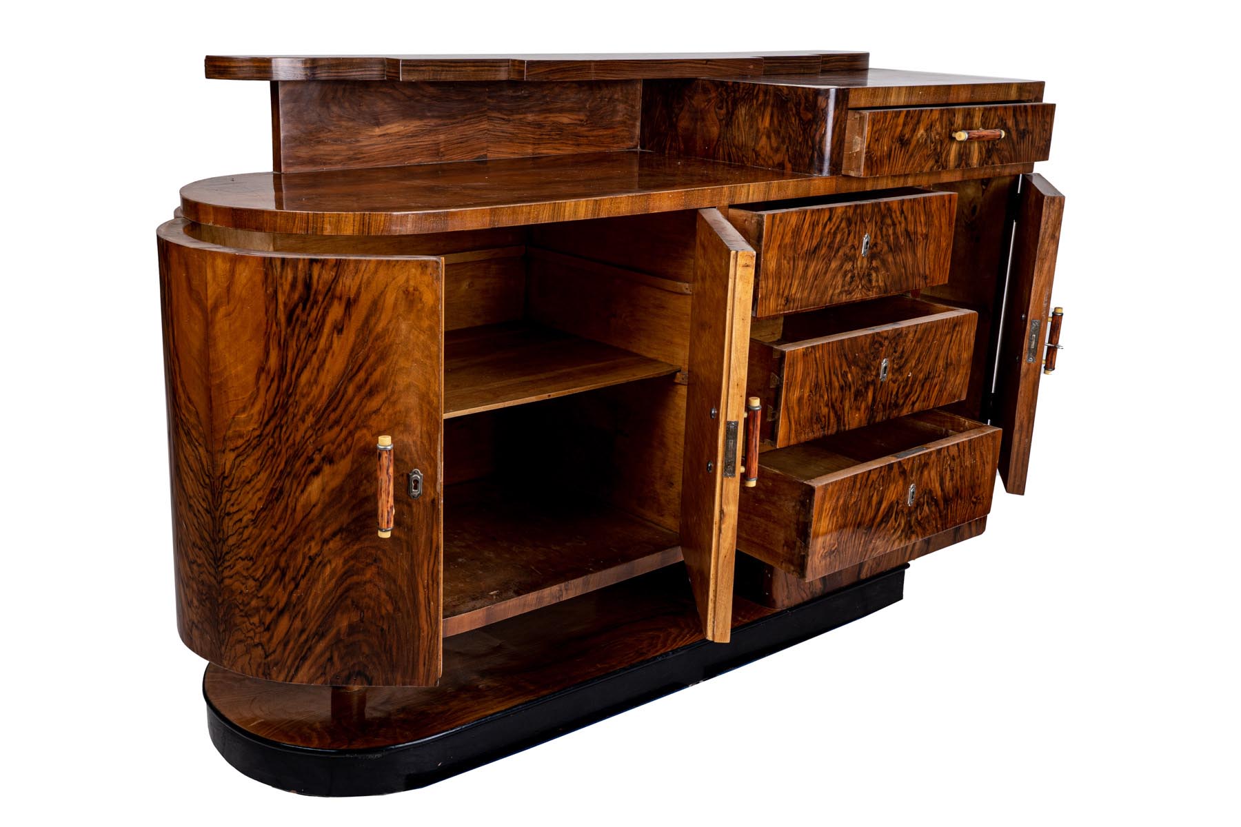 in radica di noce, piano di forma arrotondata con una piccola alzatina ed un cassetto, tre sportelli e tre cassetti sul fronte, base arrotondata che riprende il piano