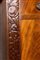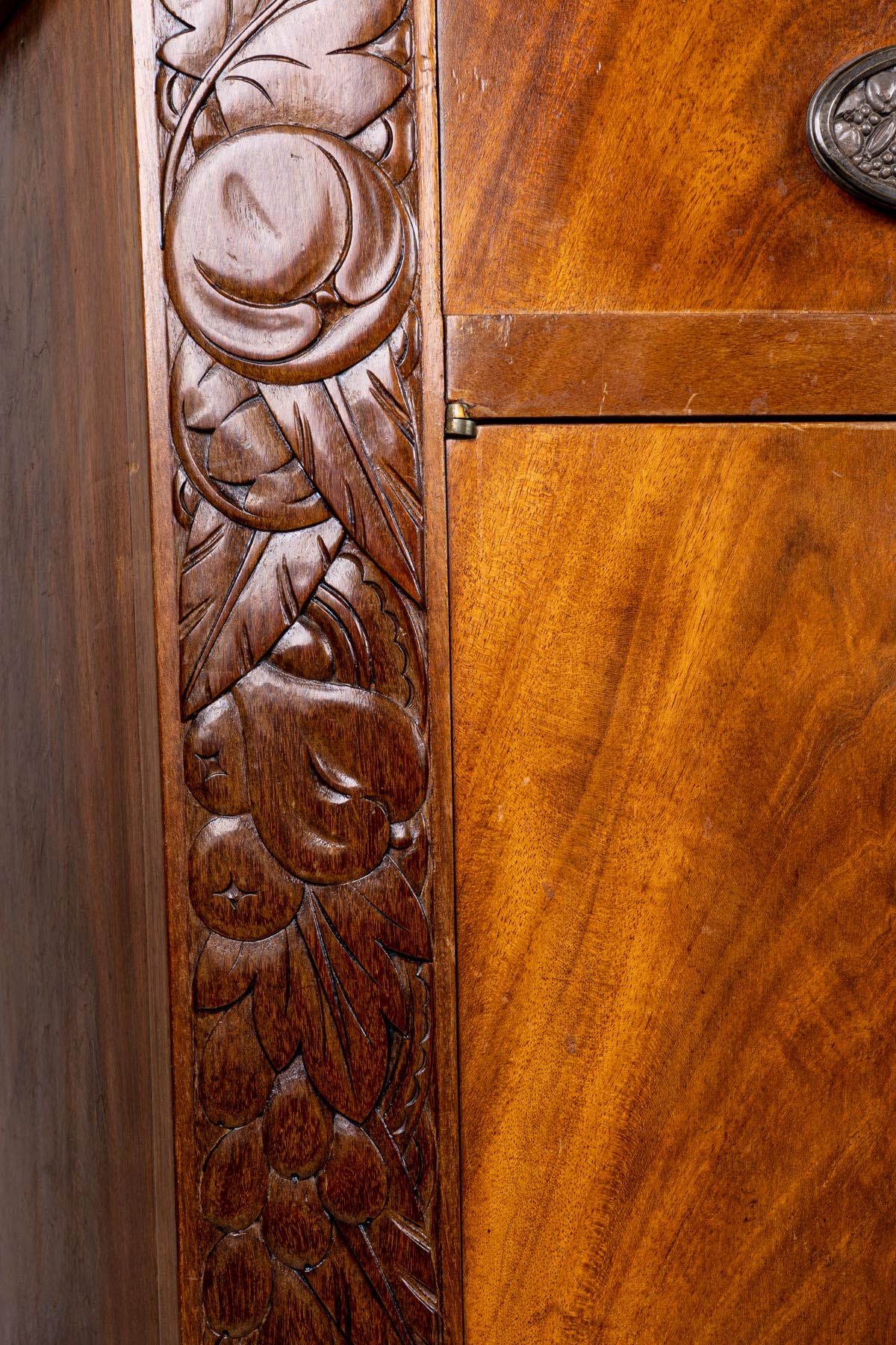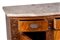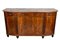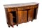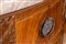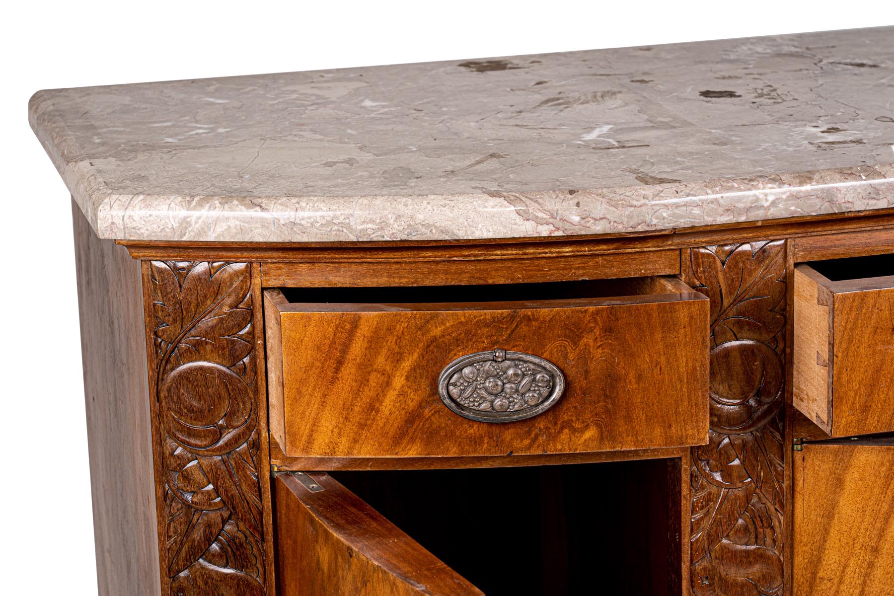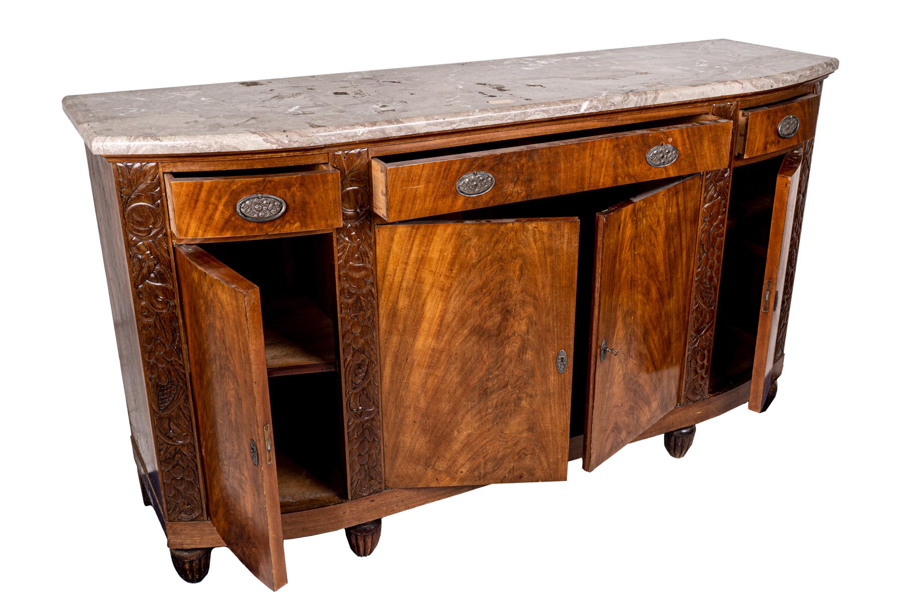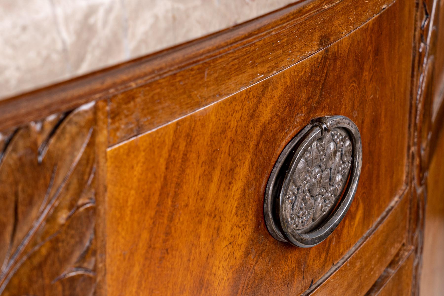 in radica di noce intagliata, piano semilunato in breccia di marmo, tre cassetti nella fascia e quattro sportelli sul fronte, intercalati da lesene intagliate a motivi fitomorfi, piedi a cipolla scanalati