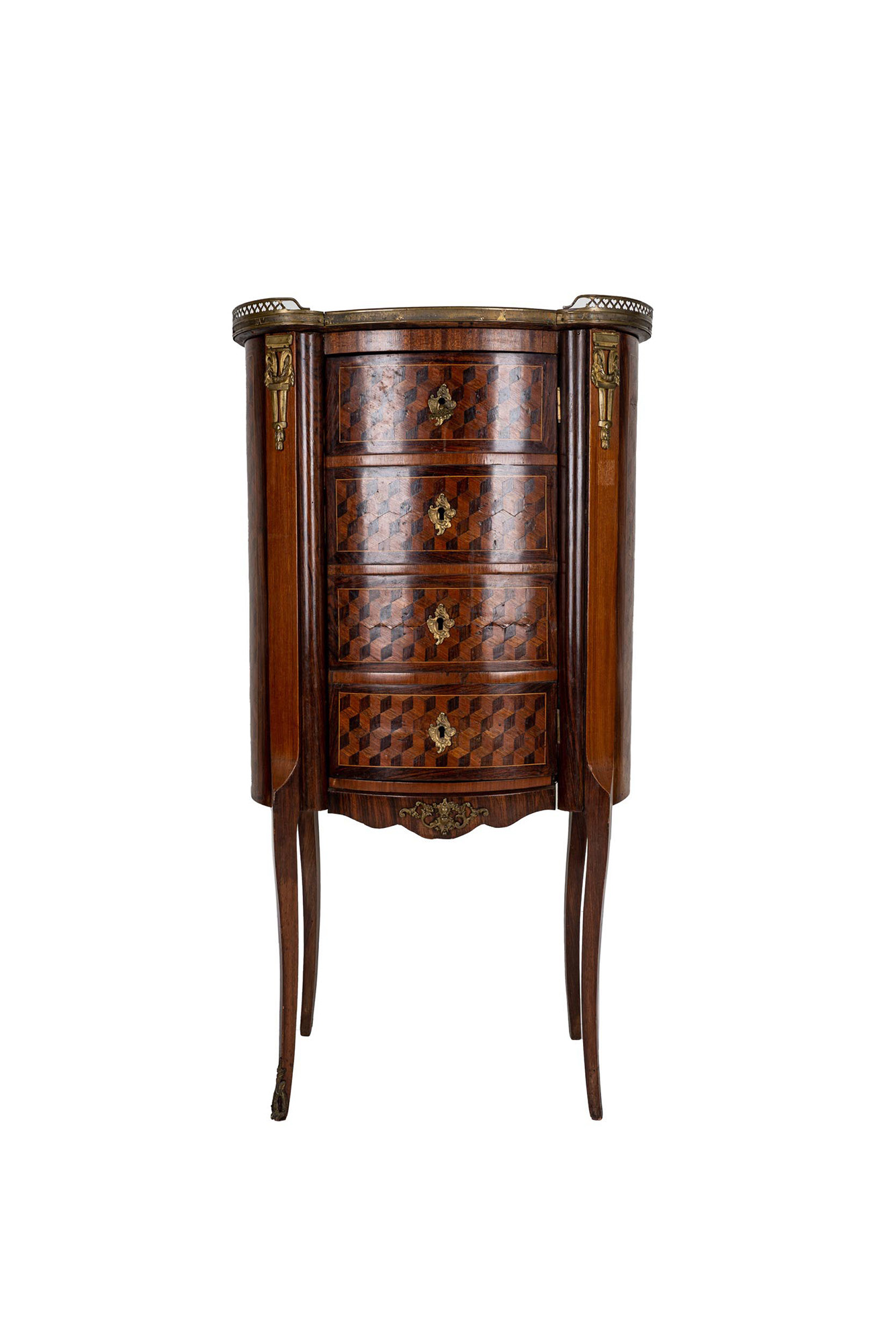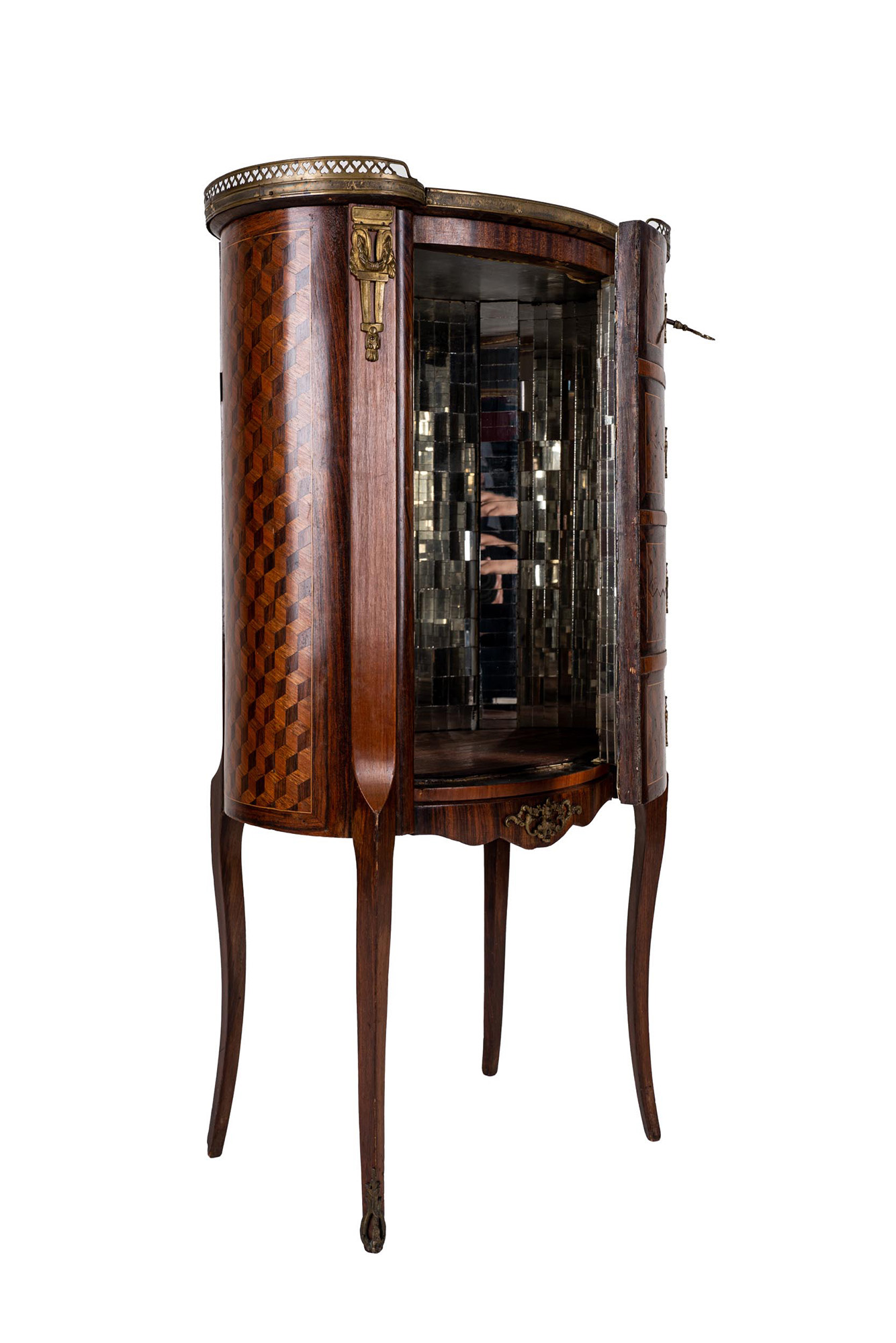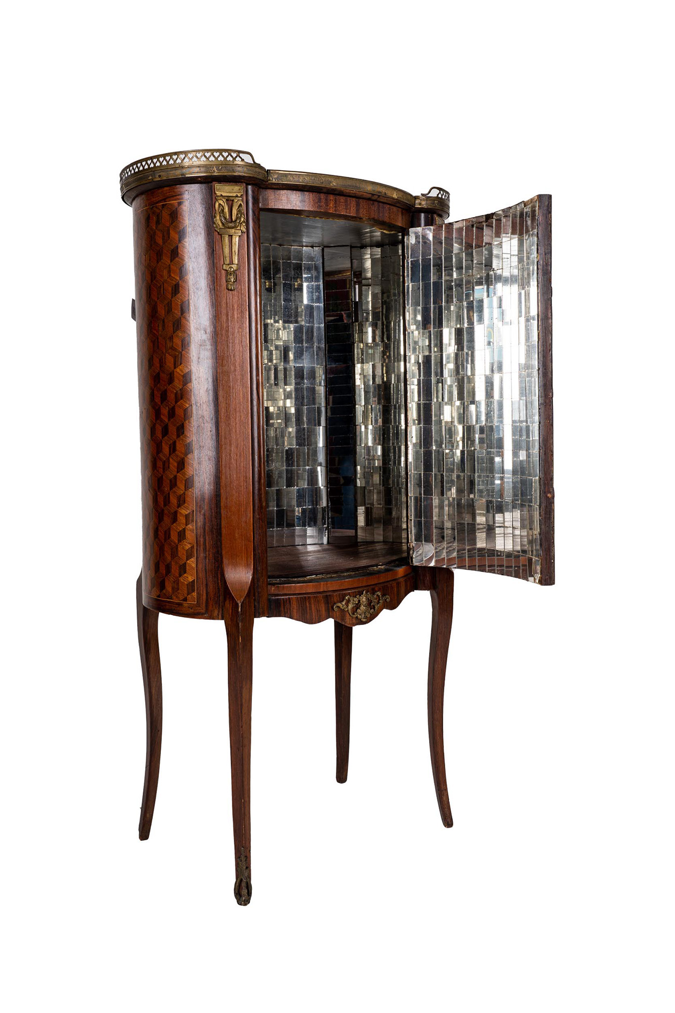 intarsiato a marqueterie in bois de rose e bois de violette, con finiture in bronzo dorato, piano superiore ovale in marmo con bordo a terrazzino, quattro cassetti frontali che mascherano uno sportello, interno a specchi pendaglina sagomata, gambe sinuose