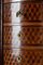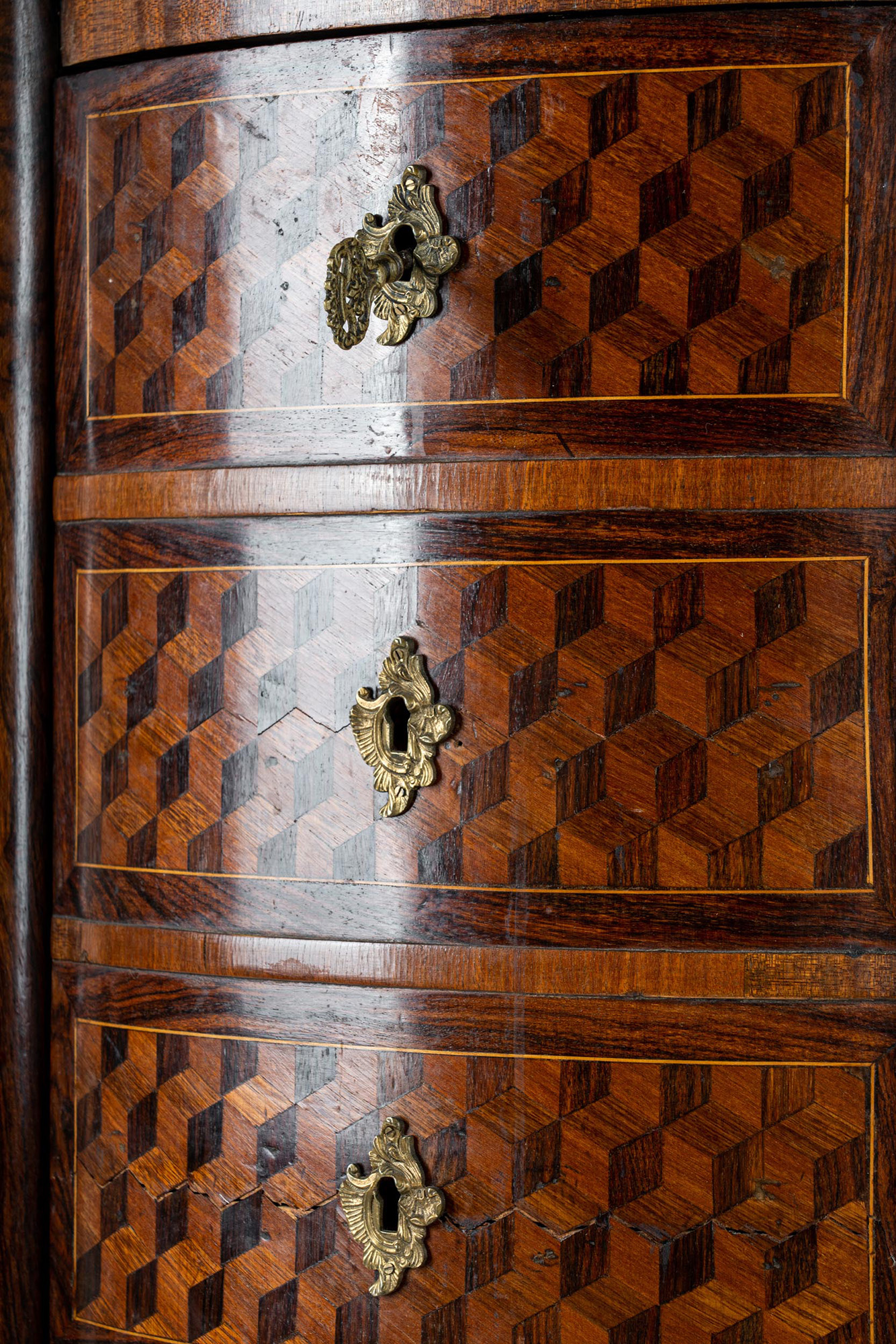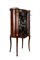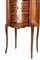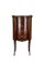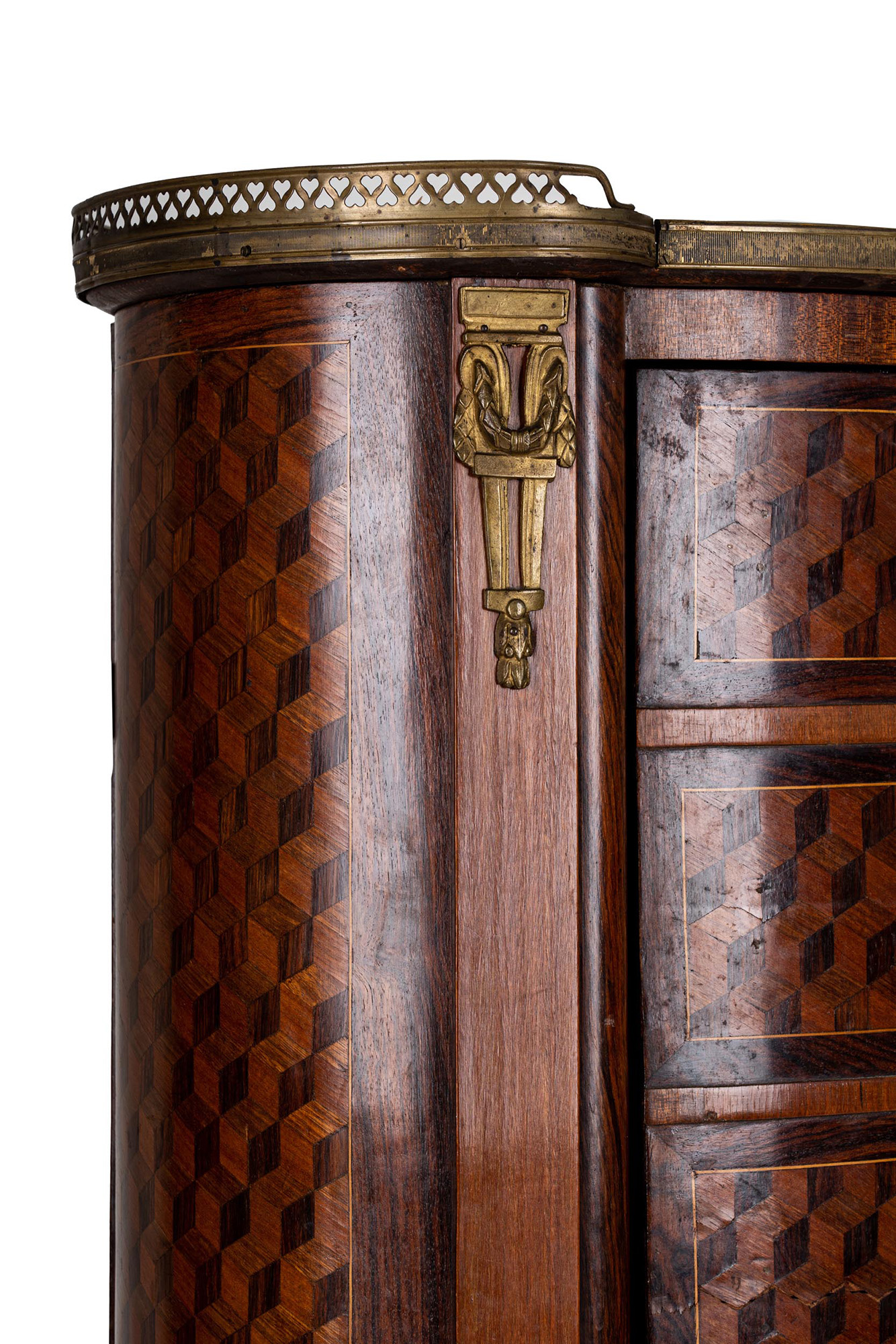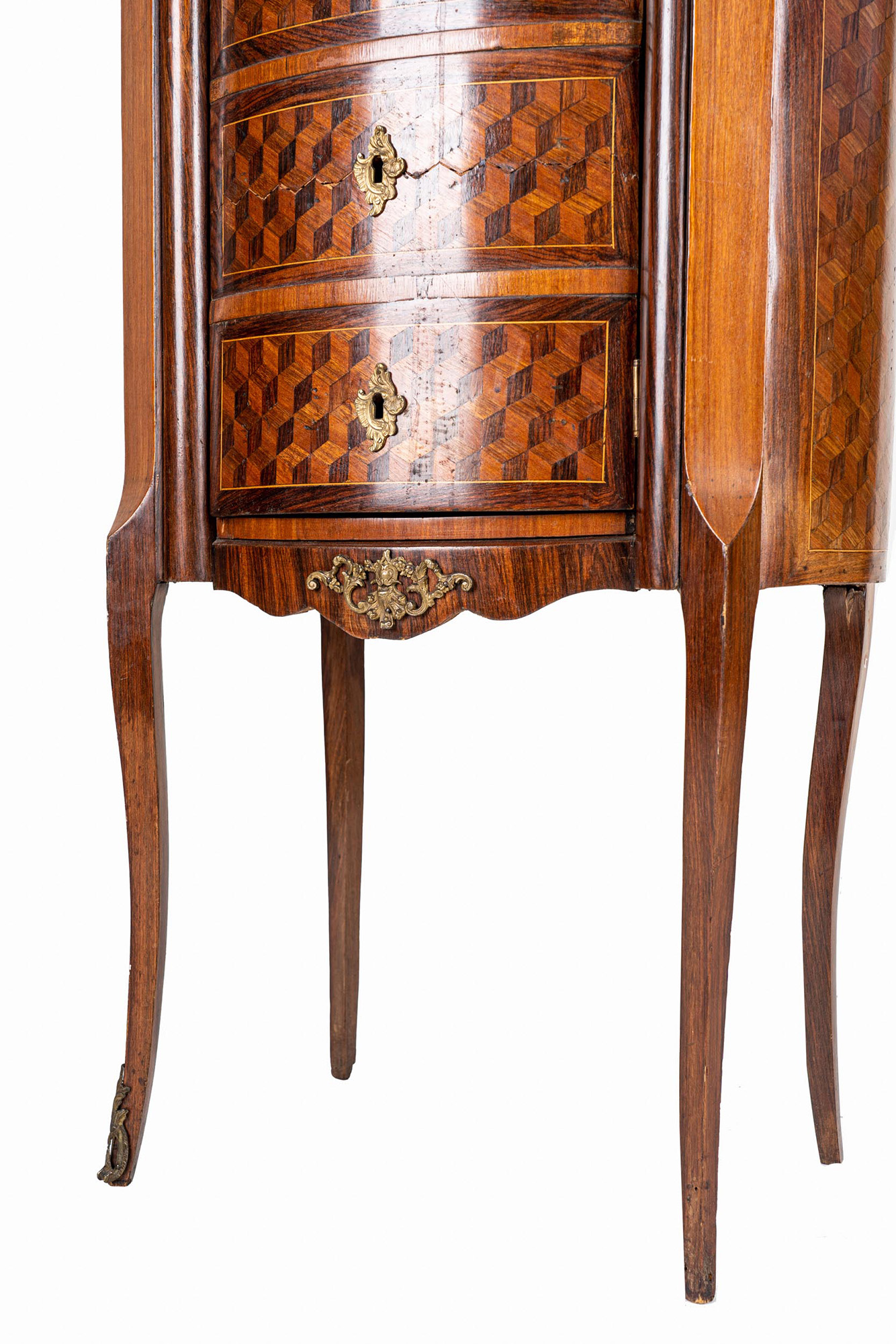intarsiato a marqueterie in bois de rose e bois de violette, con finiture in bronzo dorato, piano superiore ovale in marmo con bordo a terrazzino, quattro cassetti frontali che mascherano uno sportello, interno a specchi pendaglina sagomata, gambe sinuose