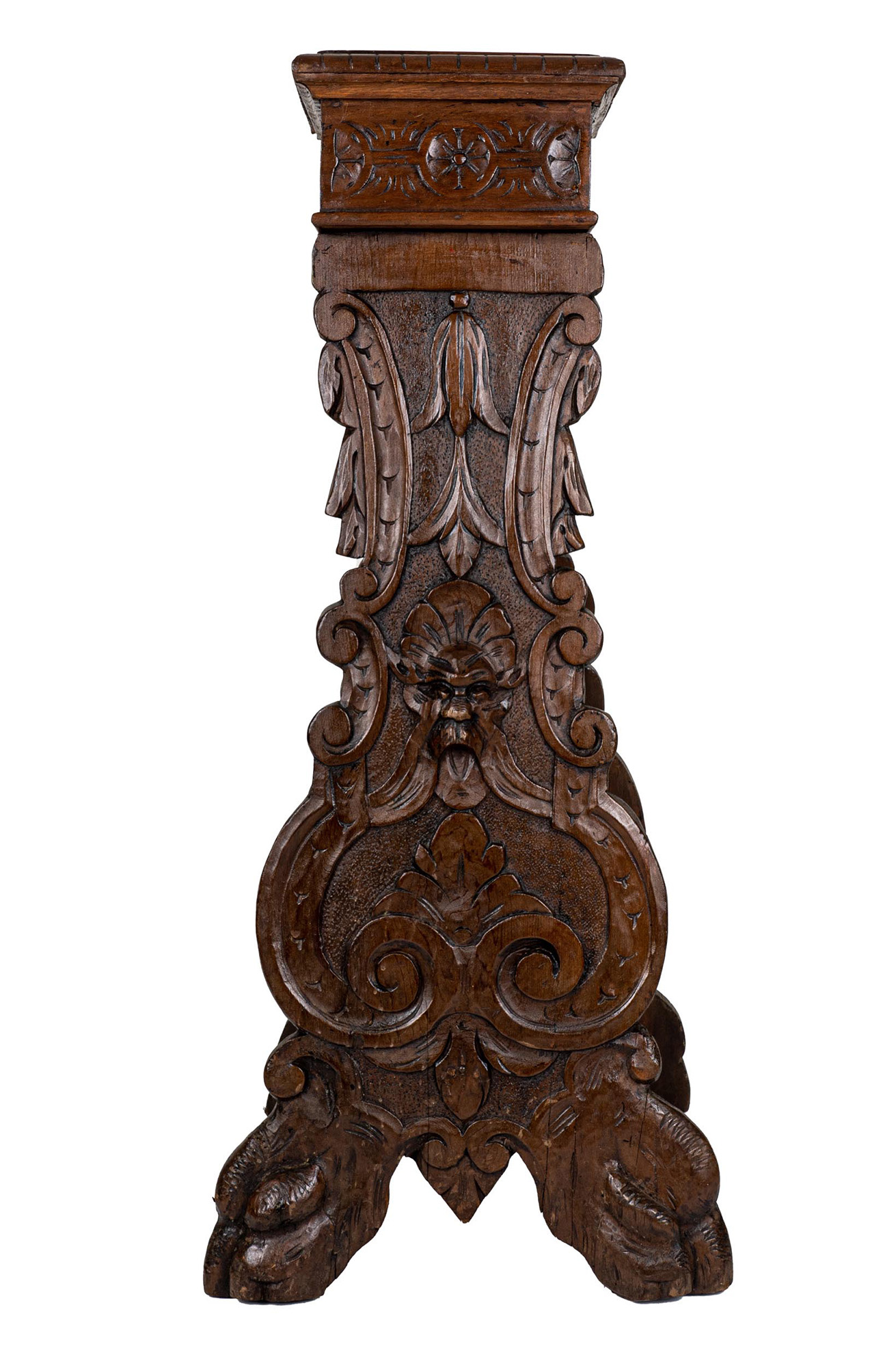 in stile rinascimentale, in noce intagliato, piano superiore quadrato con bordo baccellato, gambe sagomate decorate a volute fitomorfe e centrate da mascherone, piedi in foggia leonina