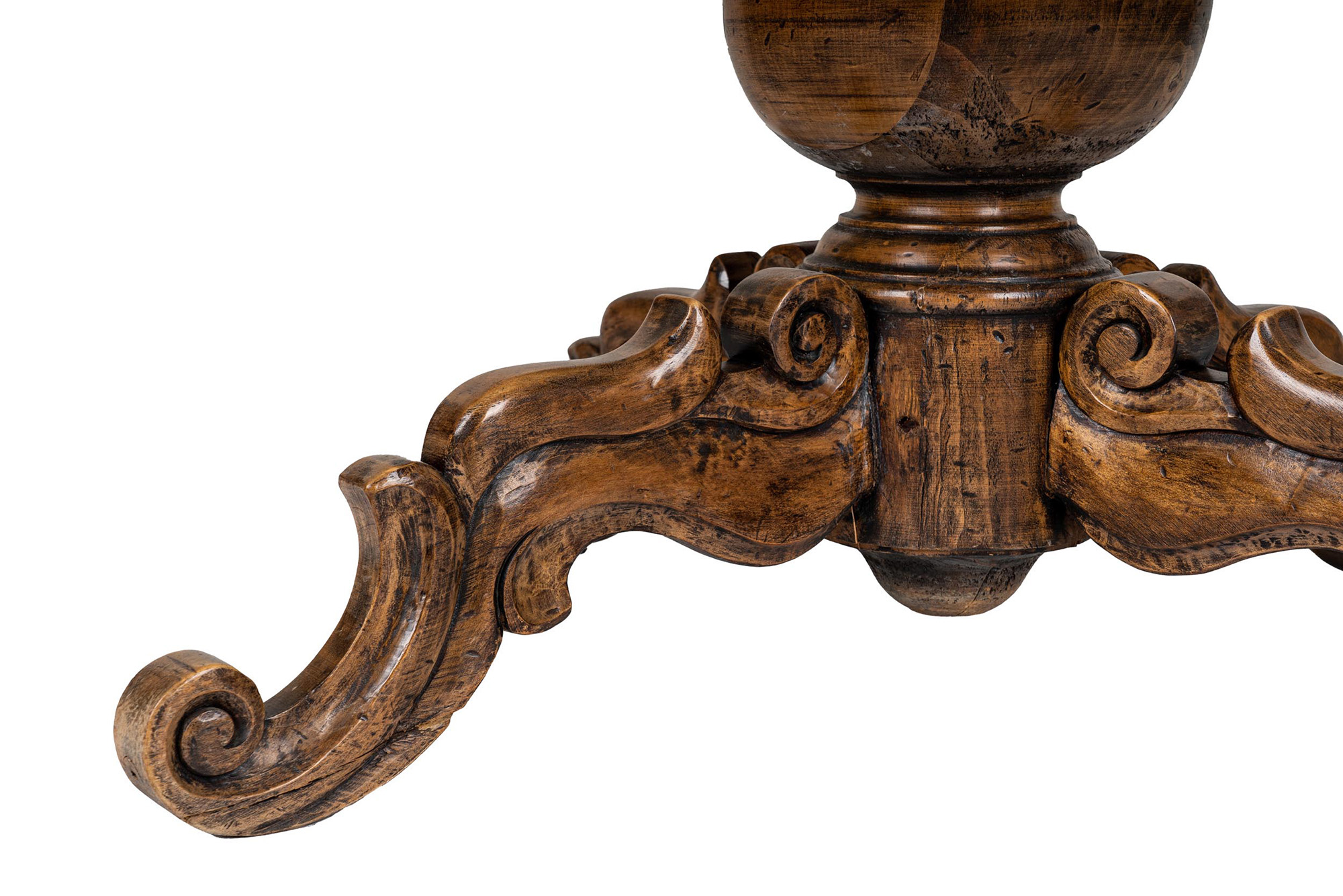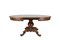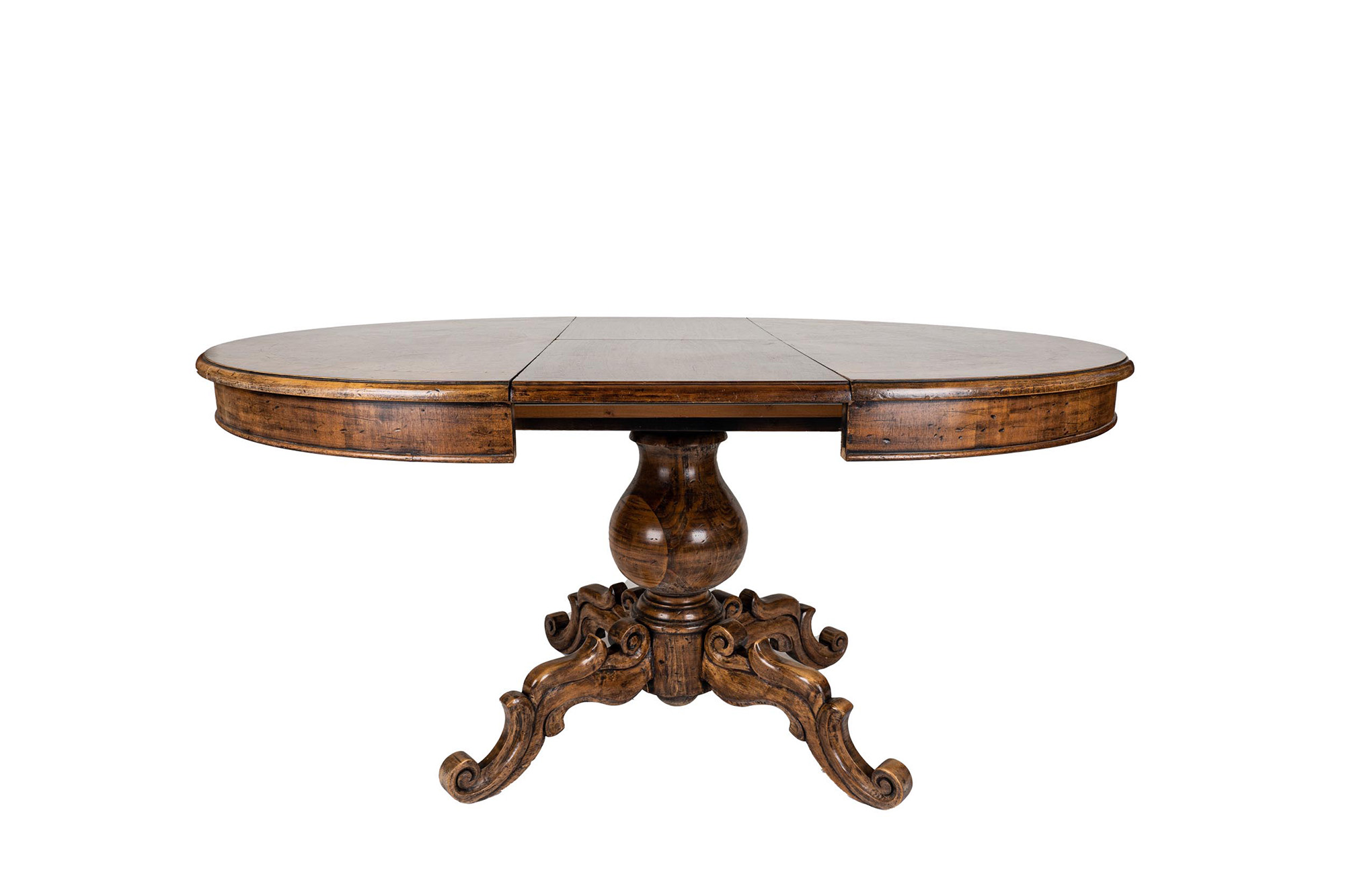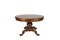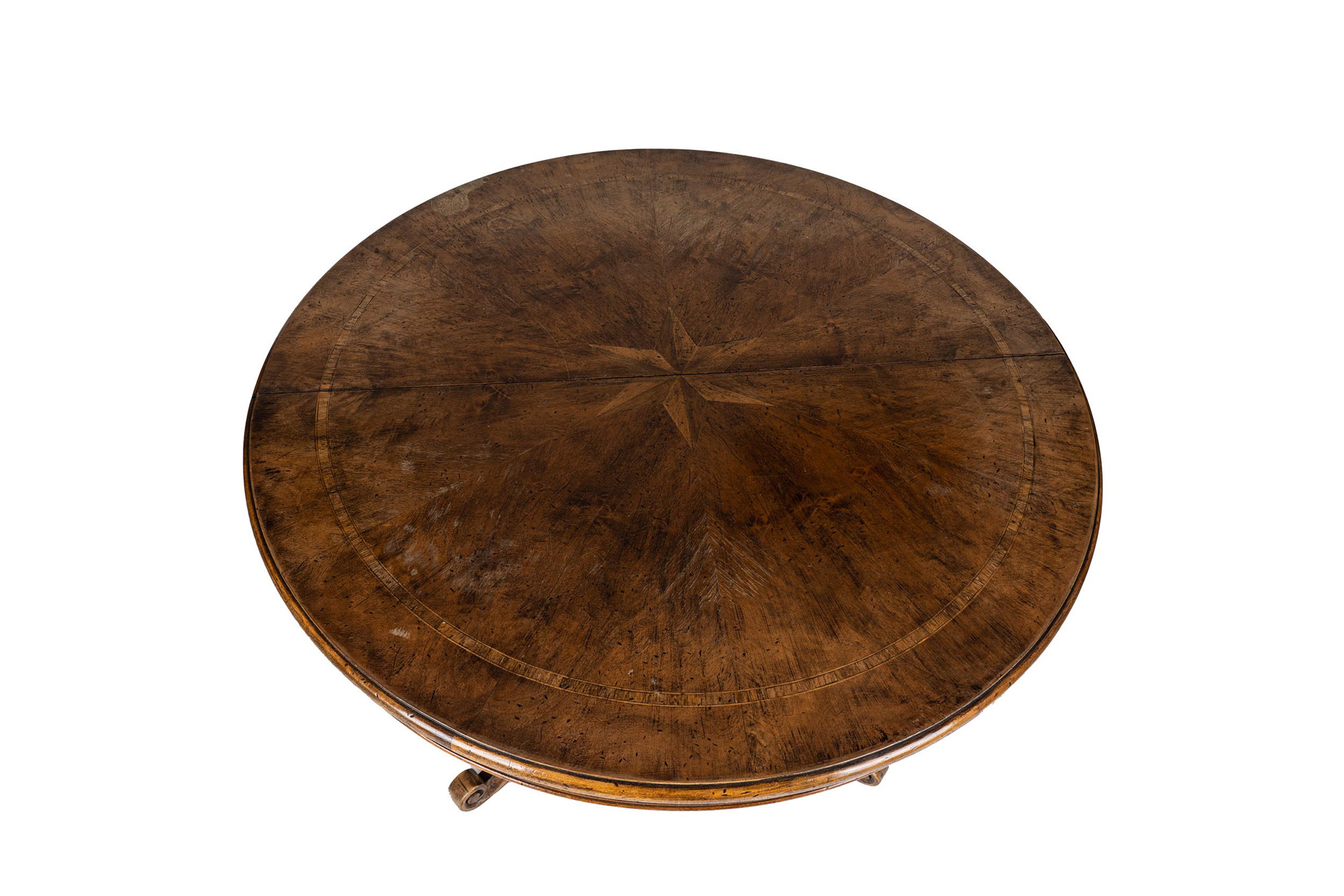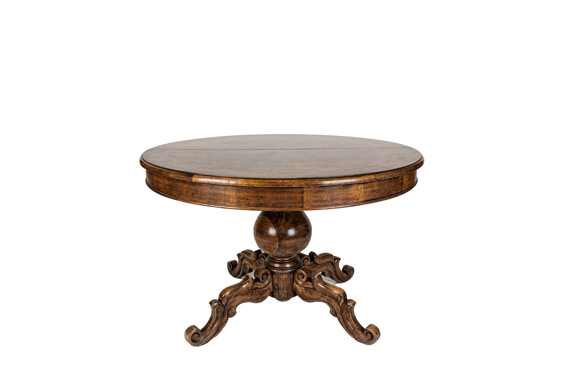 in noce e radica, piano circolare, fusto tornito su quattro gambe a voluta
