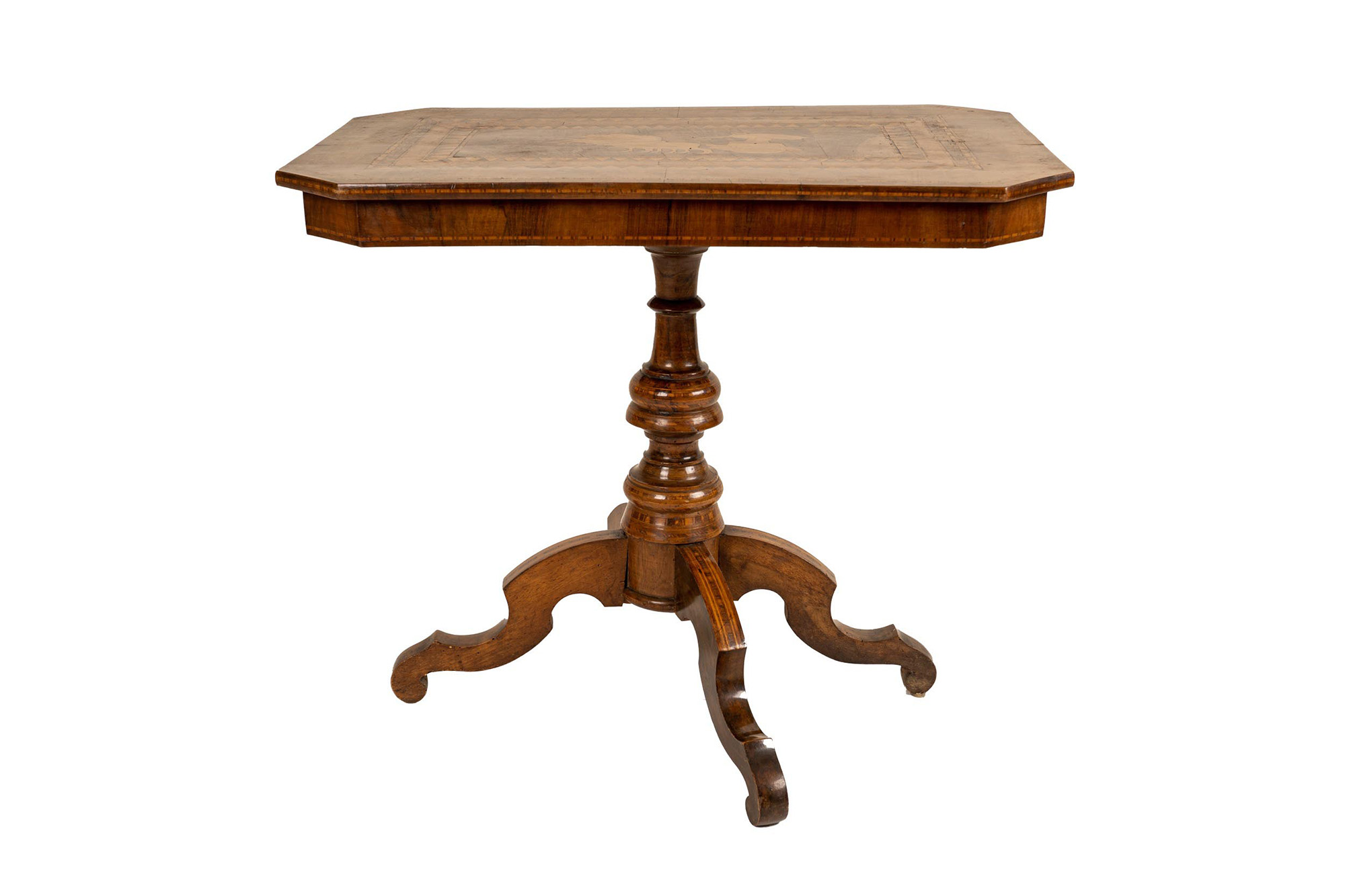 in noce intarsiato con olivo e legni di frutto, piano rettangolare con angoli scantonati, centrato da quadriga lanciata al galoppo con un giovane, probabilmente Apollo,col solo mantello sulle spalle che li sferza con la frusta.