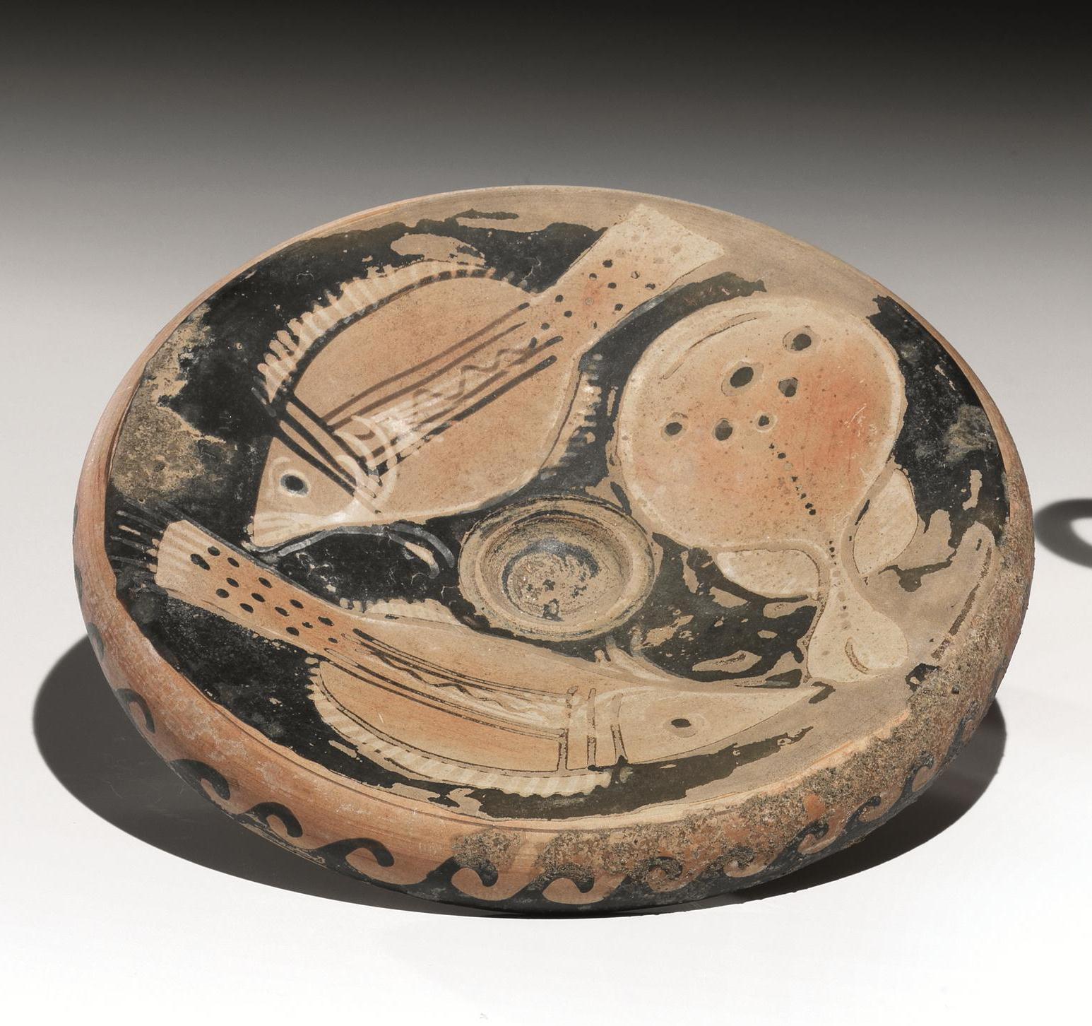 Piatto da pesce Materia e tecnica: argilla rosata, vernice bruno-nera opaca,...