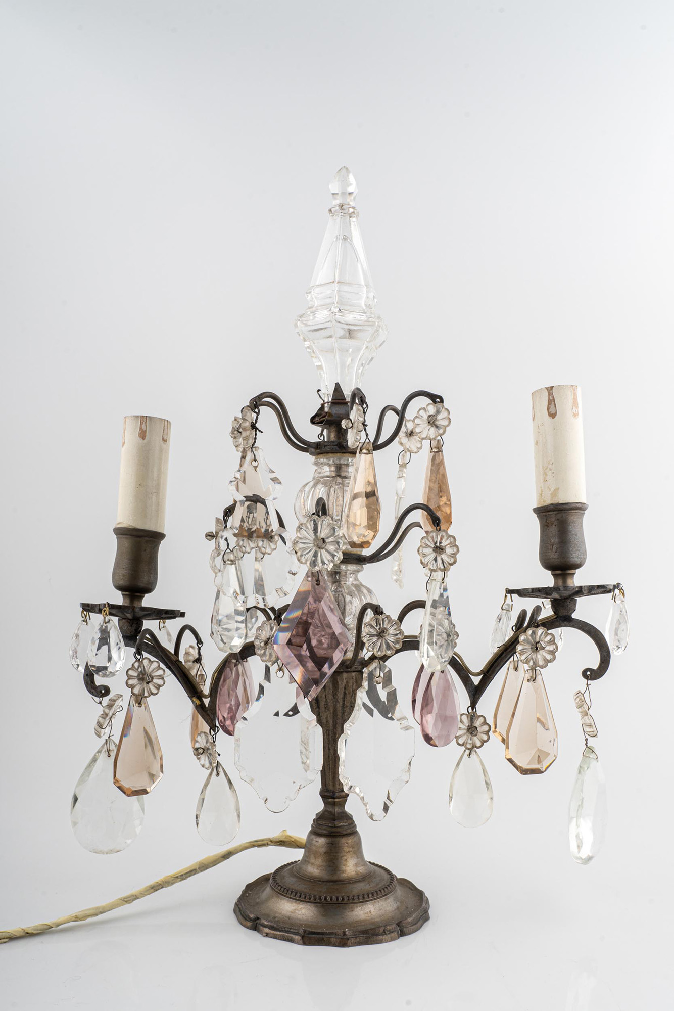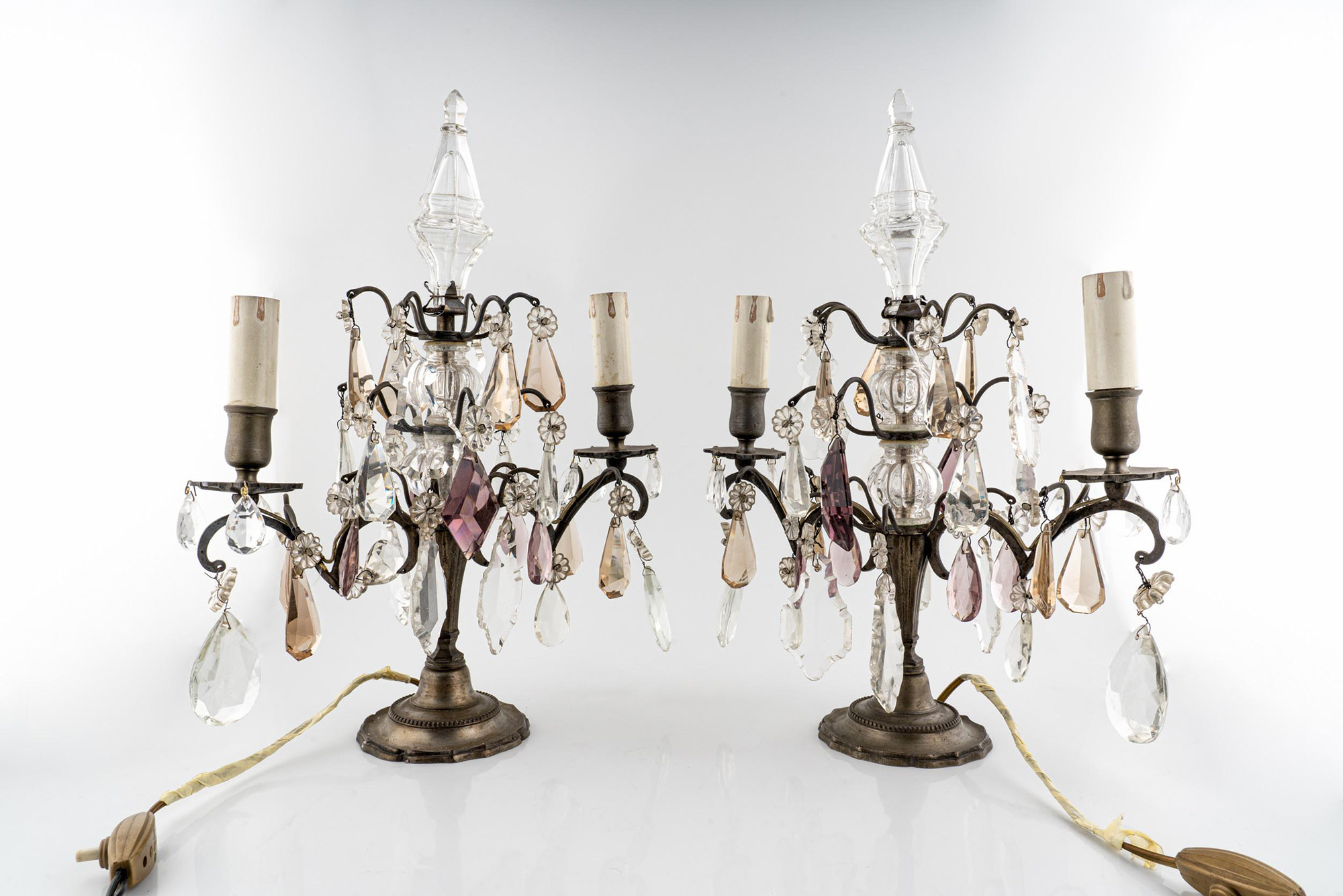 in bronzo dorato e cristallo molato a due luci ciascuna, montate ad elettricità