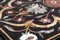 piano in marmo nero con intarsi in pietre dure semipreziose e basamento in ferro battuto