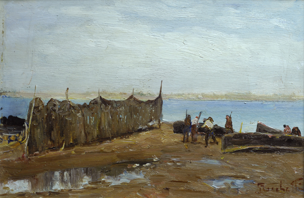 Gaetano Bocchetti (Milano, 1888 - Napoli, 1990) STESURA DELLE RETI Olio su tavola, cm. 16x24 Firma in basso a destra.