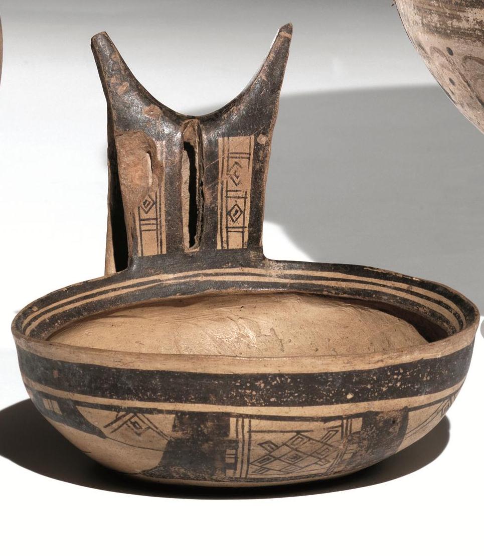 Materia e tecnica: argilla figulina beige, ingubbiatura color crema, decorazione in bruno, modellato a tornio lento