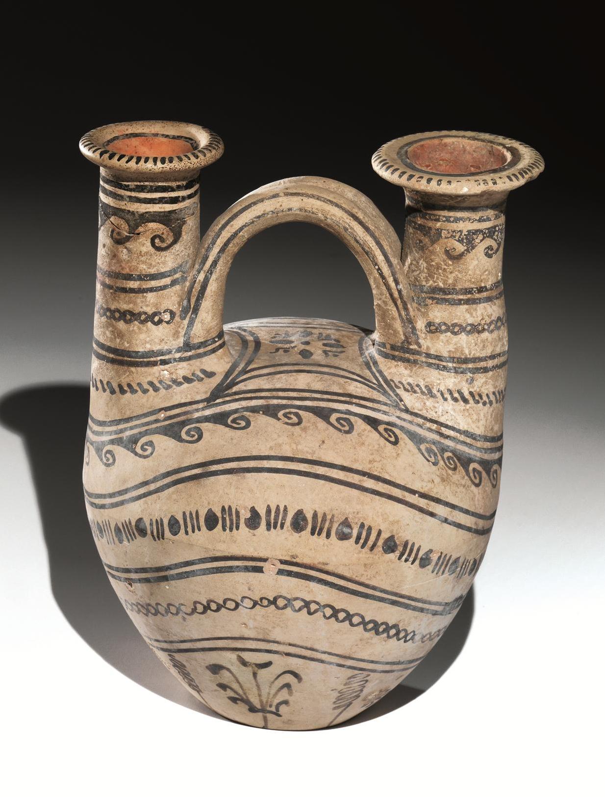 Askos doppio listatoMateria e tecnica: argilla figulina rosata, vernice bruna...