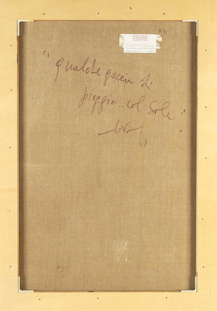 Firma in basso al centro "Dova", al retro titolo e firma" Qualche goccia di pioggia col sole, Dova" e l’etichetta della galleria d’arte Cafiso, Milano;