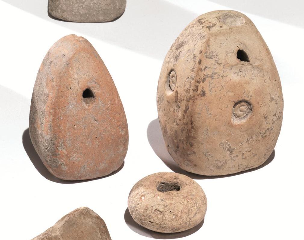 Due pesi da telaio tronco piramidali con foro per la sospensione ed una