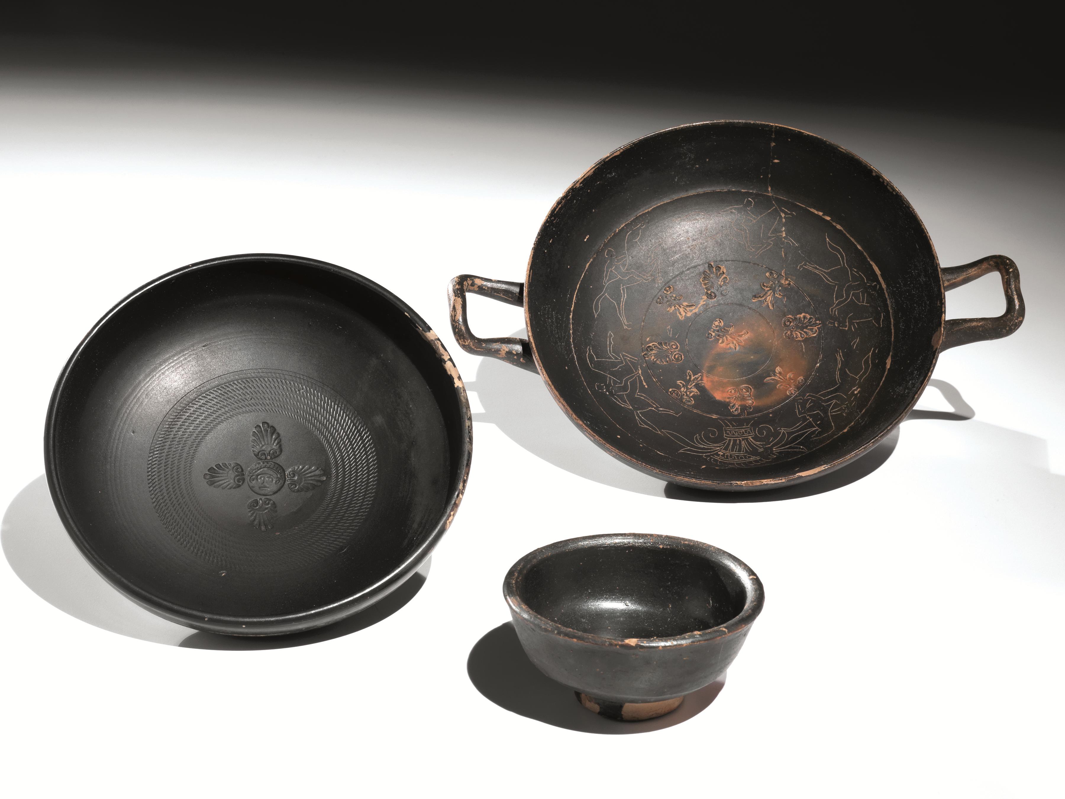 Lotto 494 | Kylix e due coppe a vernice nera Materia e tecnica: argilla figulina camoscio...