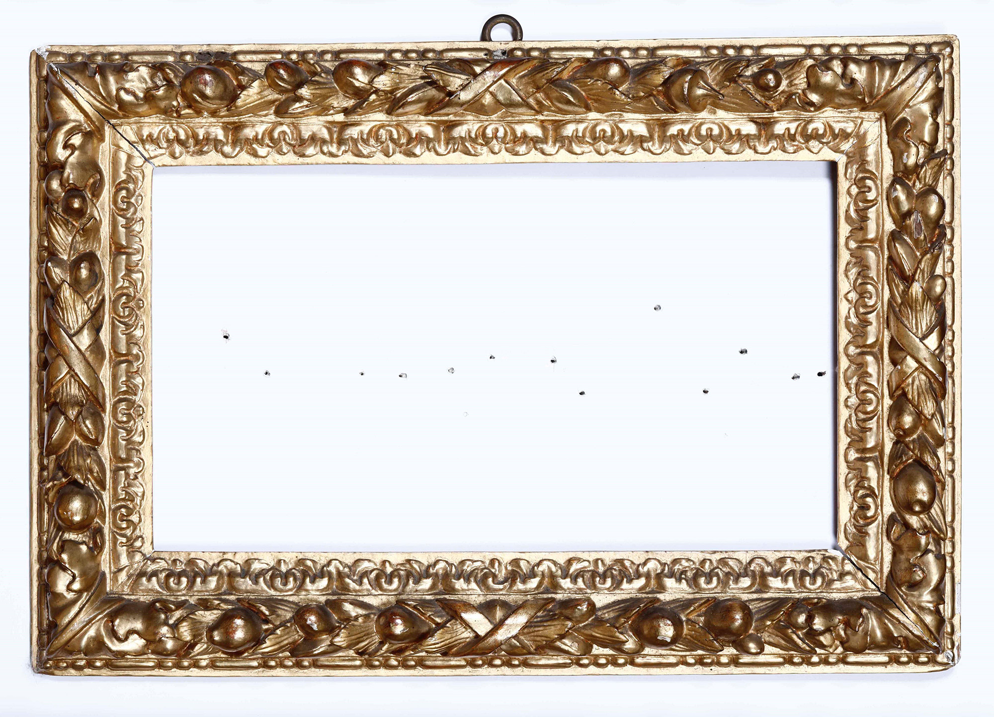 Cornice in legno intagliato e dorato. XIX secolo, fascia intagliata con motivi di foglie e frutta, luce cm 20x34,8