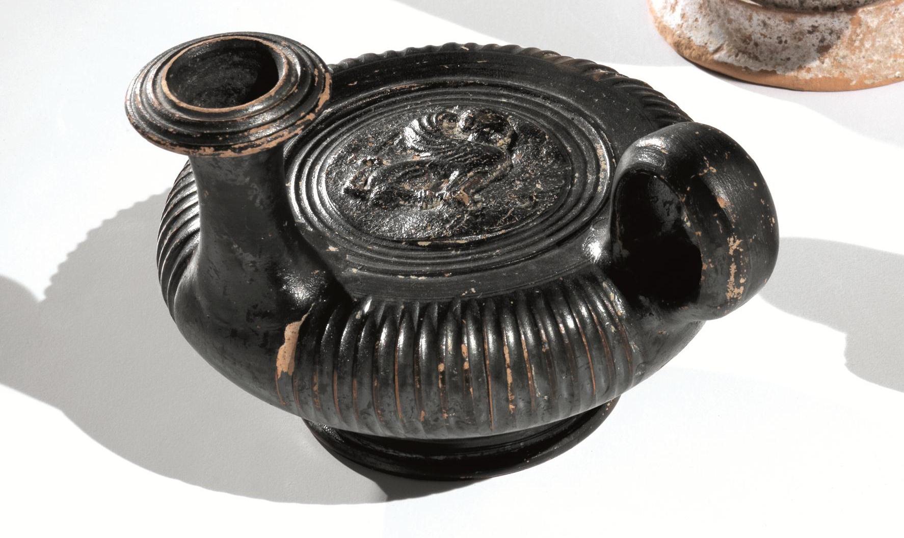 Guttus con piede cilindrico sagomato, serbatoio lenticolare schiacciato decorato a finta baccellatura, alto bocchello con orlo estroflesso scanalato, ansa ad anello impostata verticalmente; sul serbatoio medaglione a rilievo con un’arpia seduta e volta a sinistra. Risparmiato il fondo del piede