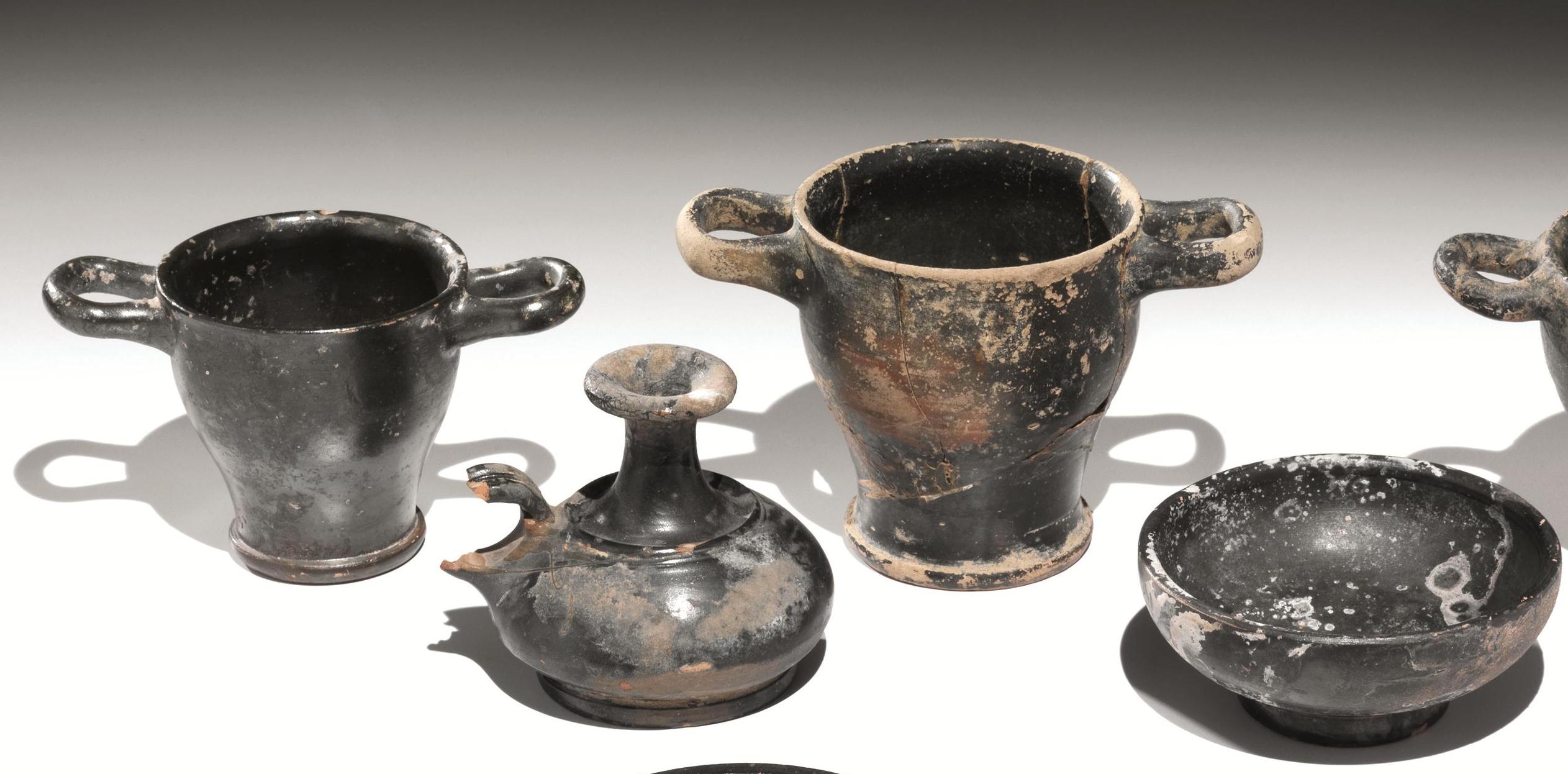 Due skyphoi con orlo leggermente rientrante corpo troncoconico allungato verso il basso, piede a d anello ed anse a bastoncello oblique; una squat lekythos con labbro estroflesso, collo cilindrico e corpo lenticolare schiacciato, piede a disco, ansa ad anello verticale; una coppetta con vasca emisferica e piede troncoconico (4)