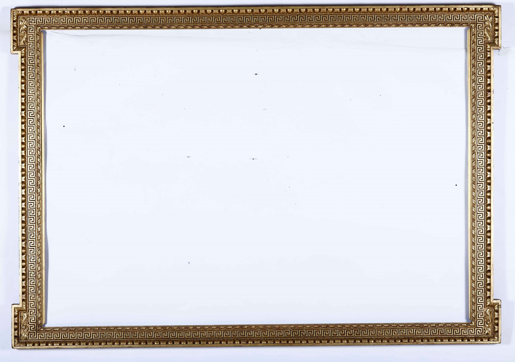 Grande cornice in legno intagliato e dorato. Inizio XIX secolo, fascia decorata con greca, cm 134,5x194