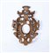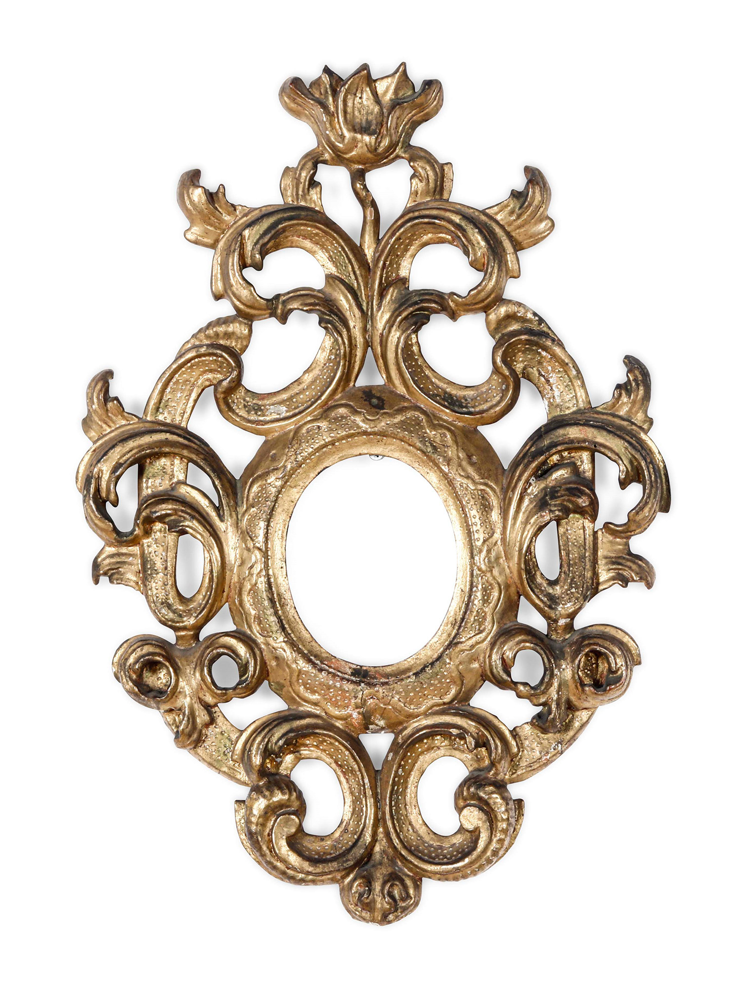 Cornice ovale in legno intagliato, bulinato e dorato. Emilia XVII secolo, mostra ovale con battuta liscia, decori traforati a volute, elementi fogliacei e fiore sulla sommità, cm 43x30 luce cm 10,5x8,5
